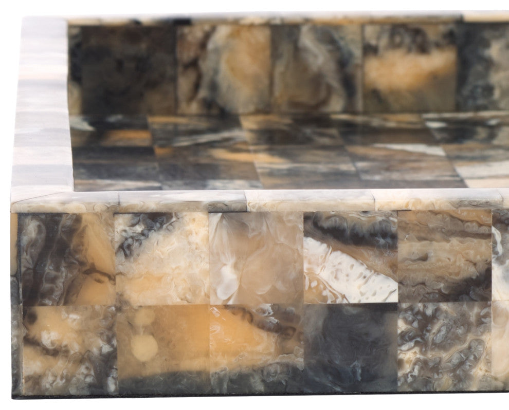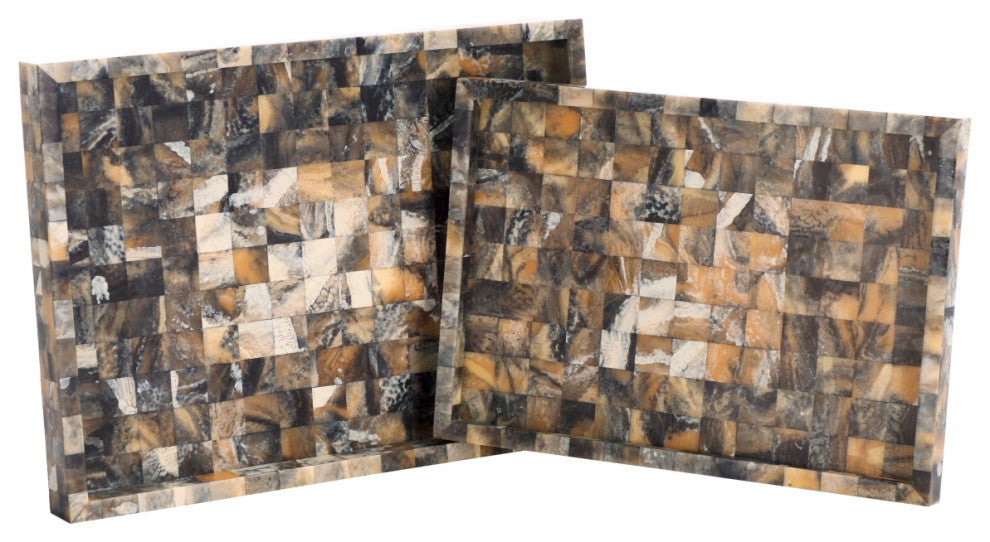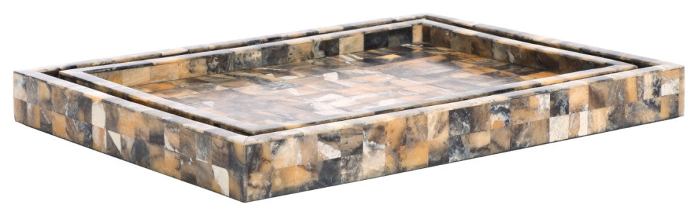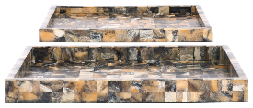 Introducing the Lori Tray Set, a duo of sophisticated accents designed to elevate the decor of any room. Imbued with the silent charm of antique green and horn hues, these trays exude a vintage aura complemented by their modern functionality.Crafted from a blend of resin and MDF, the Lori Tray Set showcases an intricate faux marble effect, reminiscent of the natural beauty of stone. Each piece is thoughtfully designed in a rectangular shape, granting a unique and rich visual texture to the overall appearance.A masterful blend of form and function, these trays are innovatively nestable, allowing for seamless storage when not in use. Their versatile design renders them suitable for a multitude of applications, whether serving guests or displaying your cherished collectibles.This set of two trays features one slightly smaller than the other, ensuring they nest perfectly together. Their glossy finish and patterned surfaces are not only stylish but also practical, offering a durable space for the placement of items.Choose the Lori Tray Set to introduce a touch of grace and functional artistry to your space. Whether used separately or together, they promise to be a subtle yet striking addition to your interior design ensemble.Size 1 Dimension: 16"x12"x1.5"Size 2 Dimension: 14.2"x10"x1"