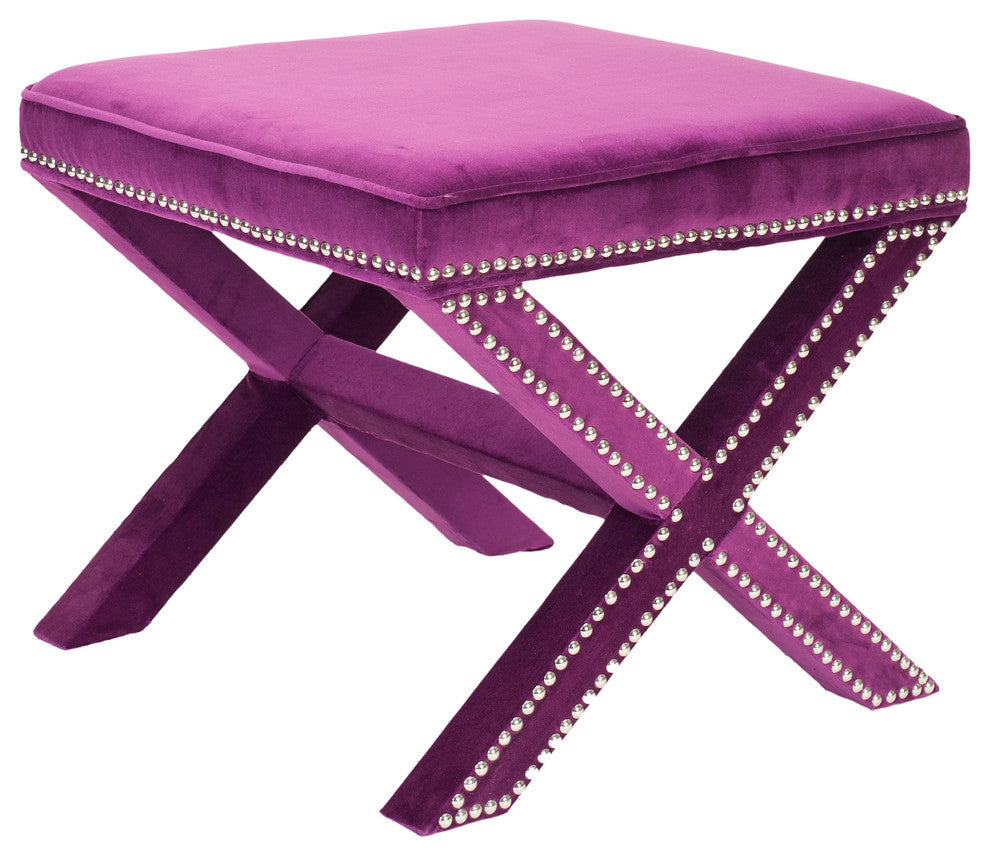 Whether you call it an X-bench or cross-bench, the Palmer Ottoman offers a designer look with all the trimmings. Its classic form complements any design style from contemporary to traditional, and its custom look comes from a sophisticated mix of plum polyester velvet and nickel nail head trim. The fully upholstered Palmer is ideal in pairs at the foot of the bed or in the living room, or use it alone as seating in a master bath.