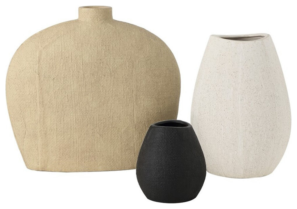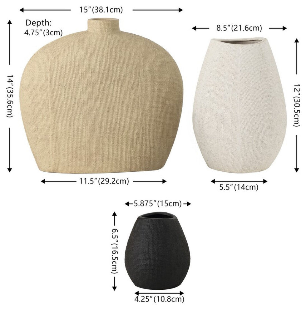 Add a touch of vintage charm to your home with the Sav Ceramic Vase Set, available in antique green and black. Constructed from ceramic, this triad of vases boast a textured finish, providing visual interest to any room. The large sandy flat vase offers an earthy base, the white vase is distinctive with its elongated body, while the black piece presents a classic silhouette, contributing various styles to your decor. Embrace rustic elegance and bring a hint of nature indoors with these antique-inspired ceramic vases.Size 1 Dimension: 15"x4.75"x14"Size 2 Dimension: 8.5"x8.5"x12"Size 3 Dimension: 5.87"x5.87"x6.5"