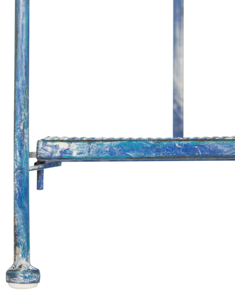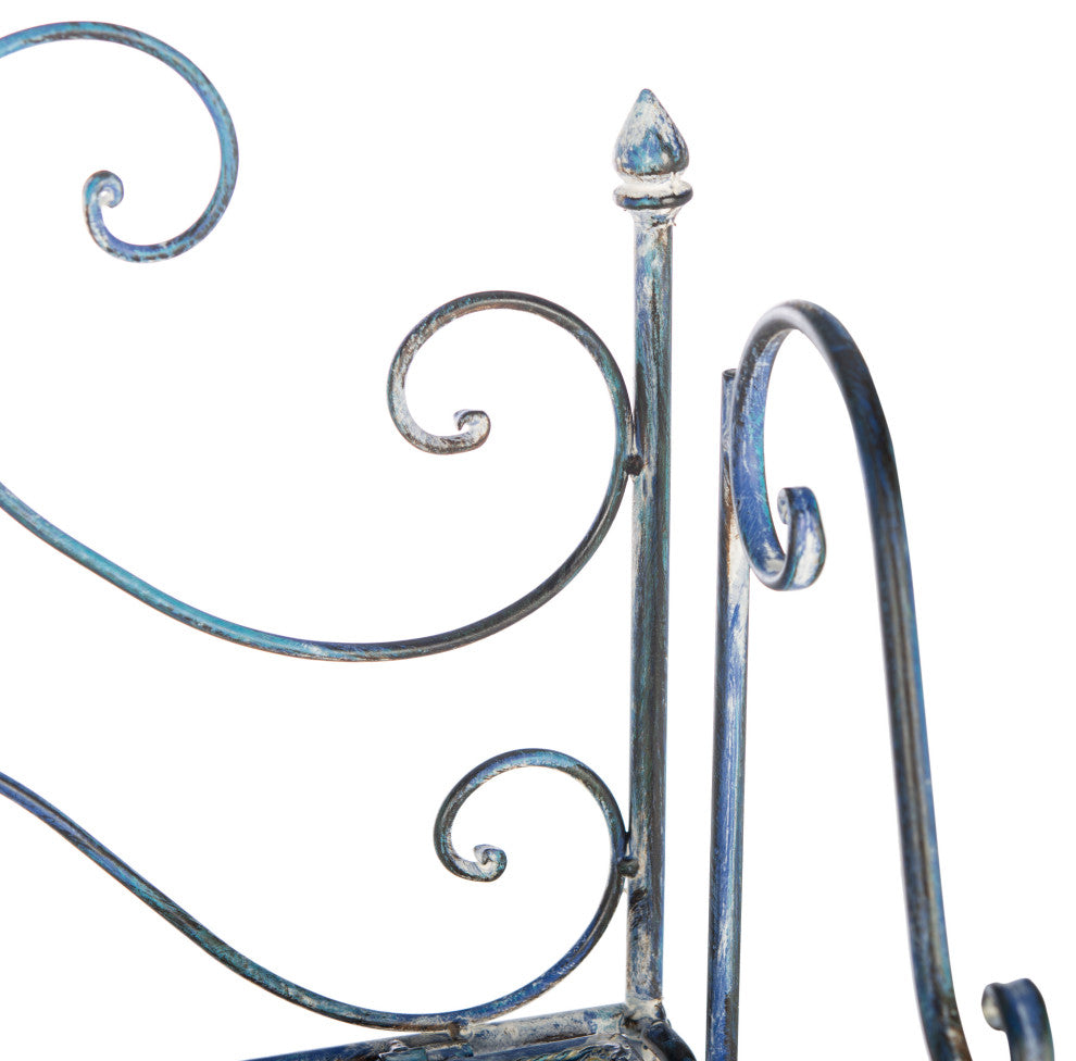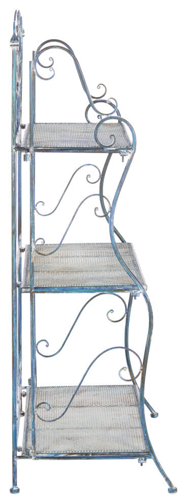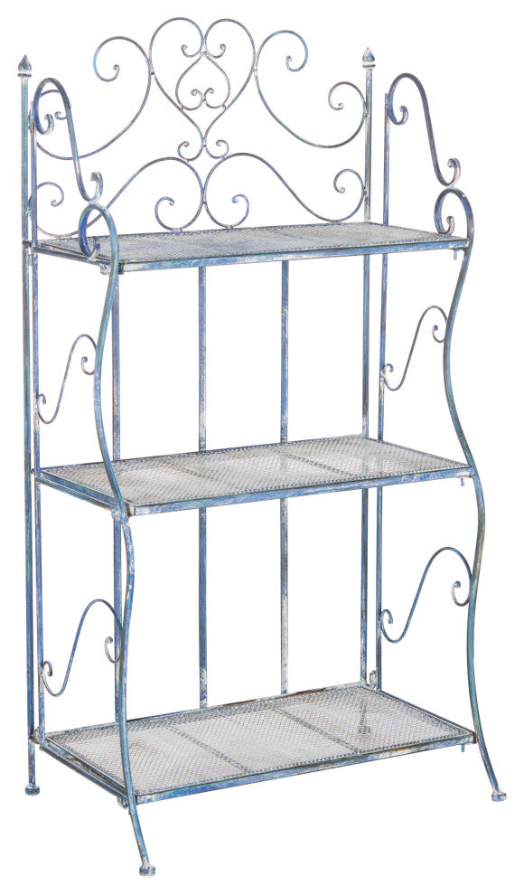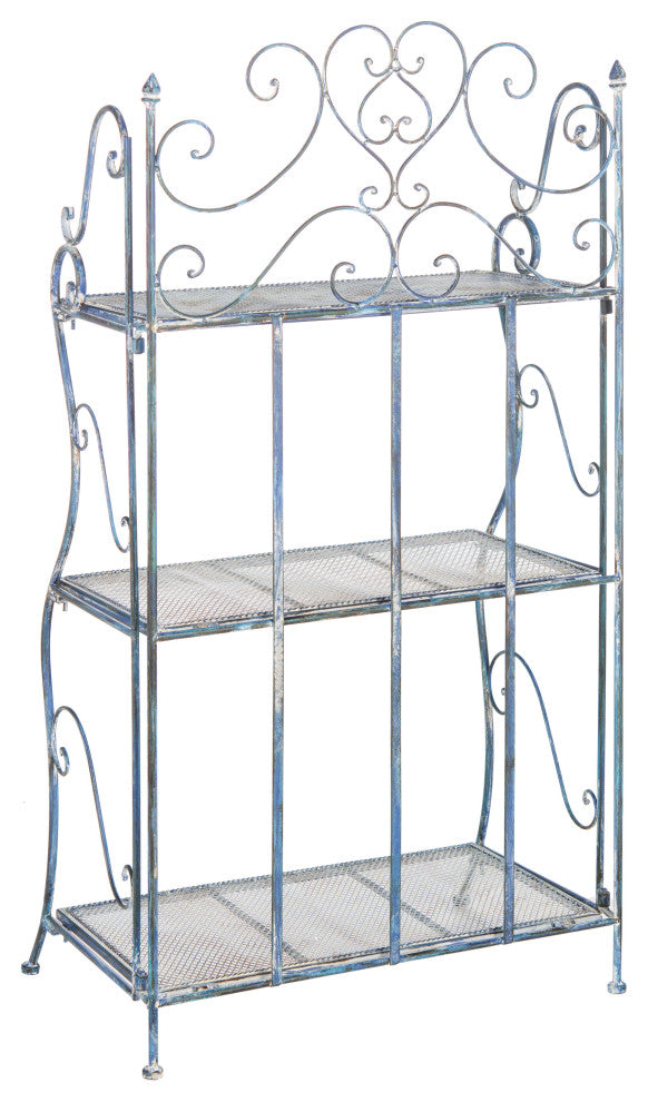 Bring charm and character to any outdoor room or garden with this beautiful Torus Shelf. Designed with elegant iron scrollwork in an antique blue finish, Torus''s three generous tiers provide ample space for stylish storage.Dimensions: 22.0" x 14.2" x 42.5"Materials: IronWeight Capacity (lbs): 30Store outdoor furniture indoors or cover well when not in use. Remove wooden furniture from standing water. Dust regularly with small brush or vacuum. Spills should be taken care of immediately before they harden or stain with a slightly dampened sponge. Do not use bleach solutions.