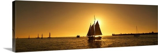 Gallery-wrapped canvas entitled, "Sailboat Key West FL".A sail boat with multiple masts photographed at sunset it in the Florida Keys on panoramic wall art.Our wrapped canvases feature a proprietary design that prevents warping or sagging over time. By using archival inks and artist-grade canvas, our premium canvases are sure to add that extra touch to any space. Lastly, our canvases are finished with a closed back that incorporates pre-installed hanging hardware for easy installation.