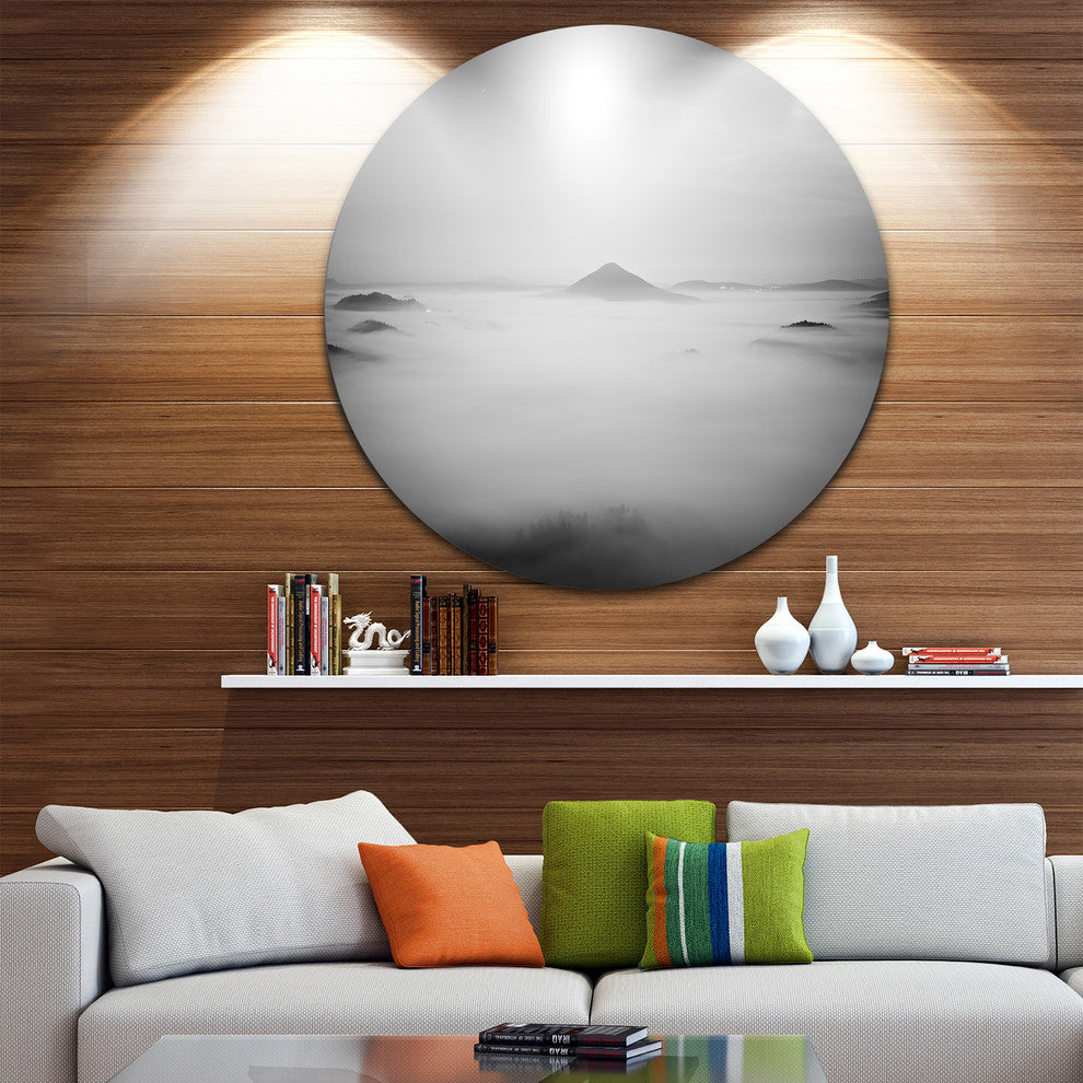 Bring Contemporary Abstraction to your home with this large Circle Metal wall art. This Sandstone Hills and Peaks in Fog Metal Artwork makes it the focal point of any room or office.