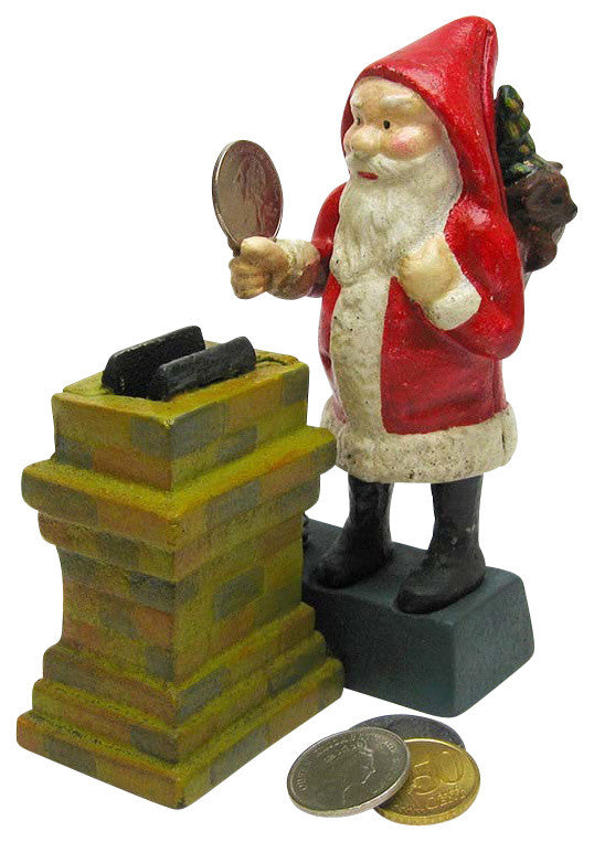It''s Christmas all year round with this replica novelty! With a push of the lever, our Victorian Santa lowers his arm to handily drop your coin into the chimney slot of this collectible, mechanical toy bank. Originally created by the Shepard Hardware Company of Buffalo, NY in 1889, this Design Toscano hand-painted, heavy cast iron, classic vintage collectors'' replica is cast from an antique bank mold with authentic die-cast metal construction. Metal turn stopper allows for coin removal. 4"Wx3"Dx7"H. 4 lbs.