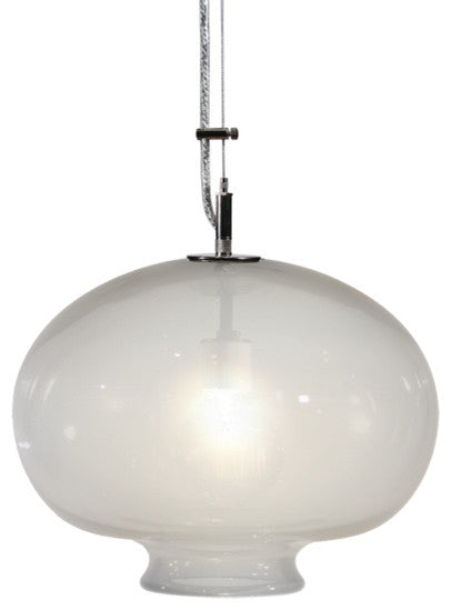 Hand-blown glass pendant by designer Joe Ginsberg. Each pendant in this collection is unique and will vary slightly due to the handmade process of glass blowing. The lighting fixture includes nickel plated hardware with a 5 inch canopy; 6 ft. braided steel electrical cord and an Edison-style Filament bulb. 60w; 120v. Made in the USA.