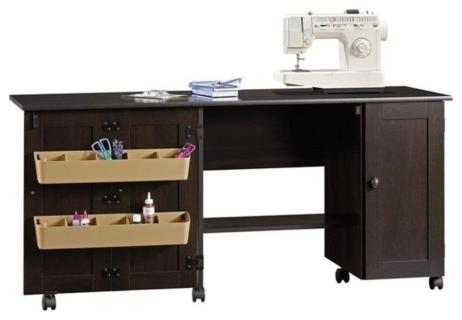 Time to get crafty! Create the perfect space to bring your thoughts and ideas to life with this craft and sewing table from the Sauder Select collection. It includes a drop leaf for extra work space! It also features storage behind a roll-open door that includes two storage bins and a hidden shelf for a sewing machine. Other features include two adjustable shelves behind the door and easy-roll casters to make it simple to transport your hobby mobile to any room. Finished in a classy Cinnamon Cherry, this versatile sewing machine cart or craft table makes creating and crafting a breeze.Features: • Drop leaf craft and sewing table provides extra work space. • Storage behind roll-open door includes two storage bins and hidden shelf for sewing machine. • Two adjustable shelves behind door • Easy-roll casters. • Cinnamon Cherry finish. • Material: Engineered WoodSpecifications: • Product Dimensions: 28.50"H x 39.29"W x 19.45"D • Weight Capacity: 75 lbs • Product Weight: 68.2 lbs