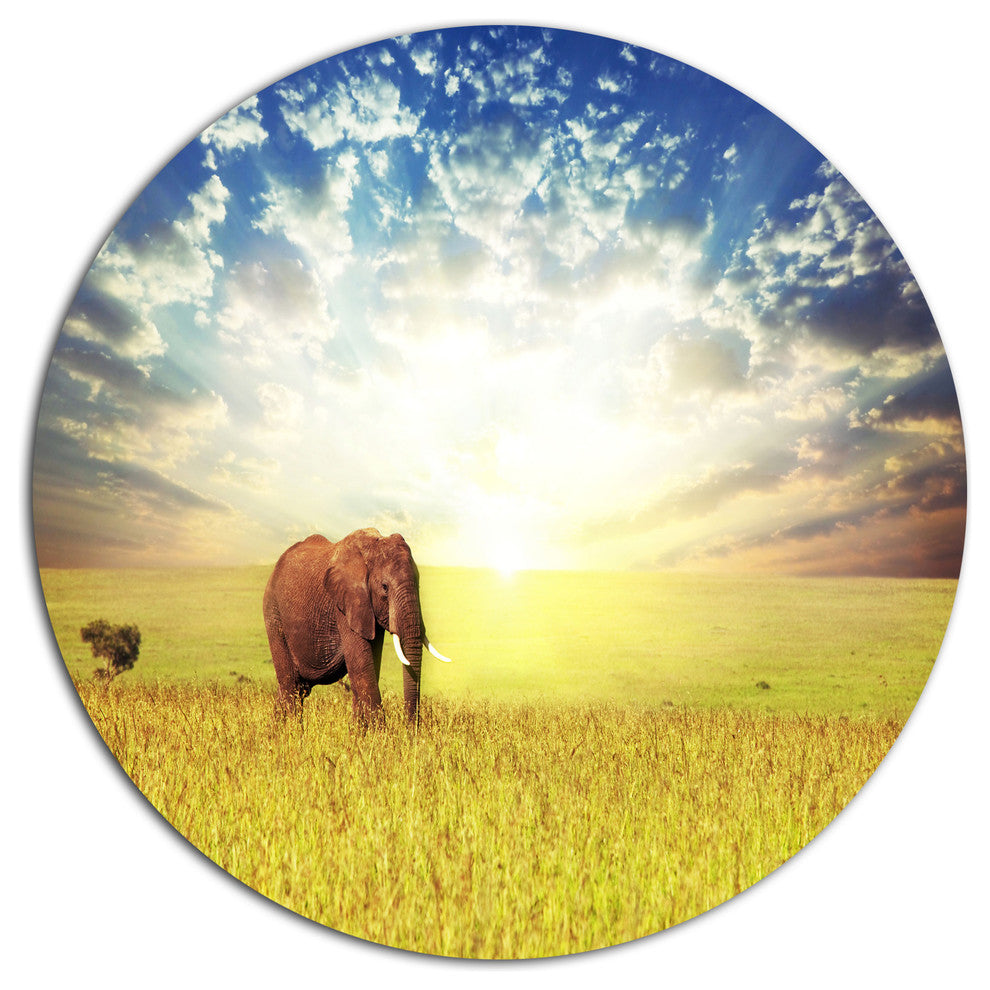 Savannah Elephant In Grassland, African Large Disc Metal Wall Art, 36"