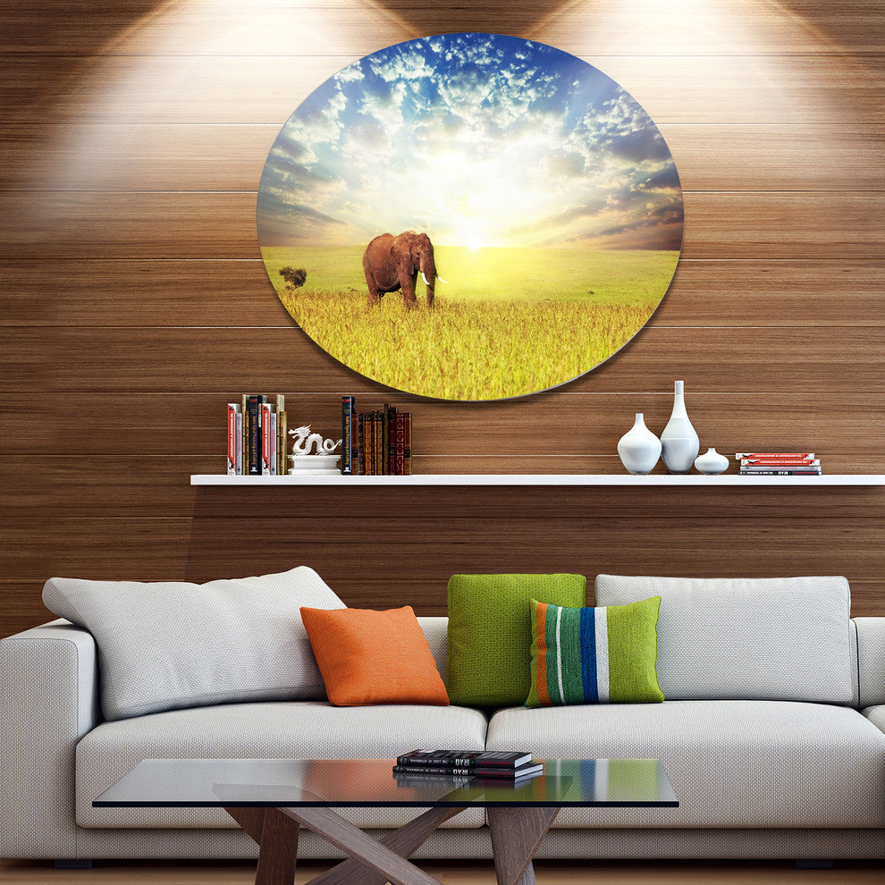 Bring Contemporary Abstraction to your home with this large Circle Metal wall art. This Savannah Elephant in Grassland Metal Artwork makes it the focal point of any room or office.