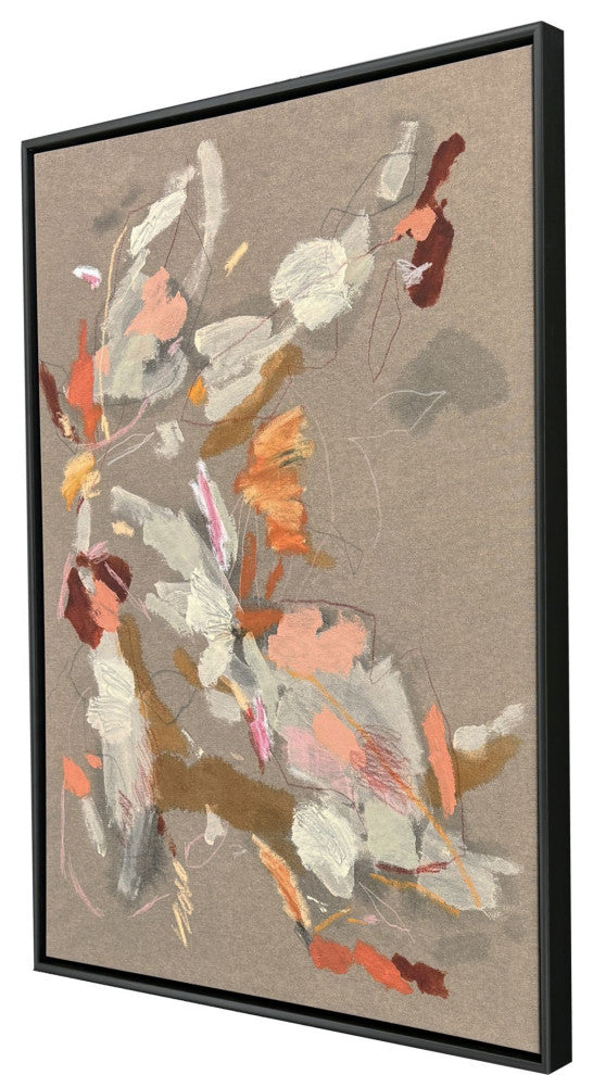 Random splashes of color converge in an alluring contemporary abstract. Giclee on canvas is mounted in a satin black wood floater frame.