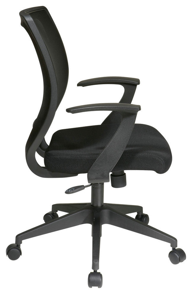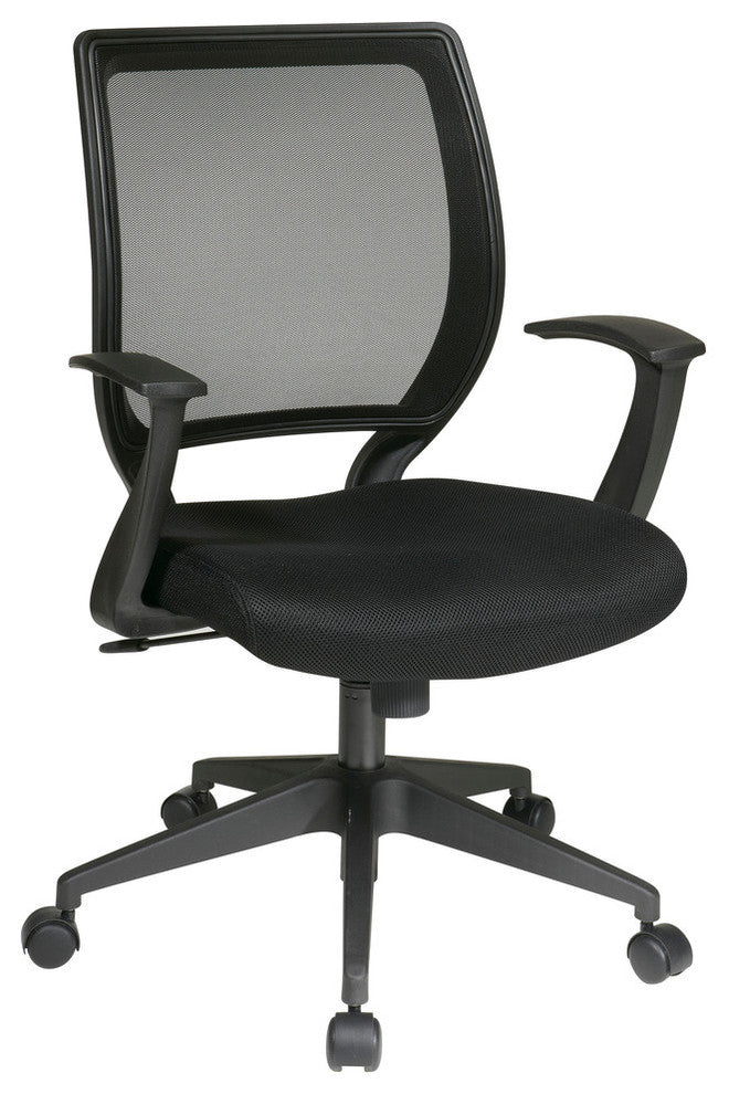 Screen Back Black Fabric Task Chair with "T" ArmsFor Use Type: Commercial Screen back and mesh seat Locking tilt control w/adjustable tilt tension Fixed designer arms Heavy Duty Angled Nylon Base with Dual Wheel Carpet CastersScreen back and mesh seatLocking tilt control w/adjustable tilt tensionFixed designer armsHeavy Duty Angled Nylon Base with Dual Wheel Carpet CastersFabric Info: BlackSeat Dimensions: 20W x 19D x 2.5TBack Dimensions: 18.5W x 18.5HSeat Height Min: 17.75Seat Height Max: 22.25Arms to Floor MAX: 24.5GREENGUARD: YesWarranty: Work Smart