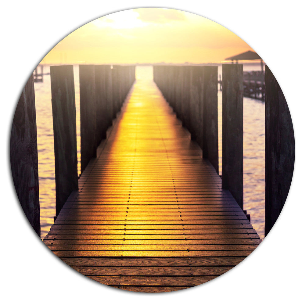 Sea Bridge With Sunset Reflection, Seashore Disc Metal Wall Art, 36"