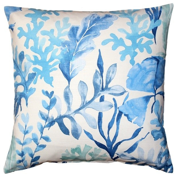 The Sea Garden Blue Throw Pillow features underwater plants in beautiful pastel blues. As the pattern does not look overly aquatic, this pillow is a great abstract home decor accent that fits in a variety of interior spaces. FEATURES- Size: 20"x20"- Fabric: 100% Cotton- Same fabric front and back- Knife edge seems- Color matched, hidden zipper closure- Handwash, cold water- Filling: Polyester Fiber Fill- Pillow dimensions always refer to the pillow cover width and length while lying flat unstuffed and are rounded up to the nearest whole inch.