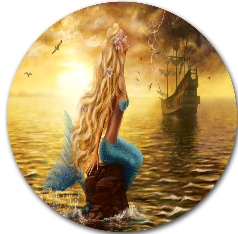 Sea Mermaid With Ghost Ship, Seascape Digital Disc Metal Artwork, 38"