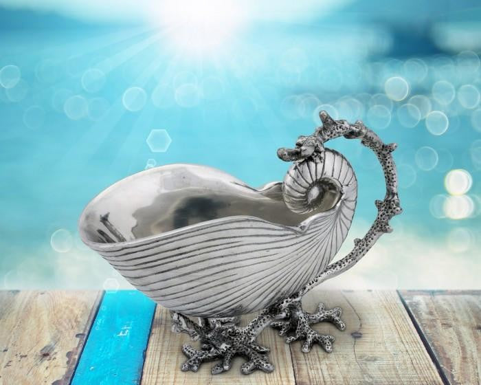 Sea Shell Sauce BoatA beautiful collection of coral constructs the piece''s base, while a long branch of the skeletal material curves into a textured handle. Shaped like a large mollusk shell, the bowl features a heavy pattern of lines around the exterior. The intricate markings along the coral make it appear darker than the rest of this handmade, aluminum design. Size: 10" L 7"TWeight: 4 lb.