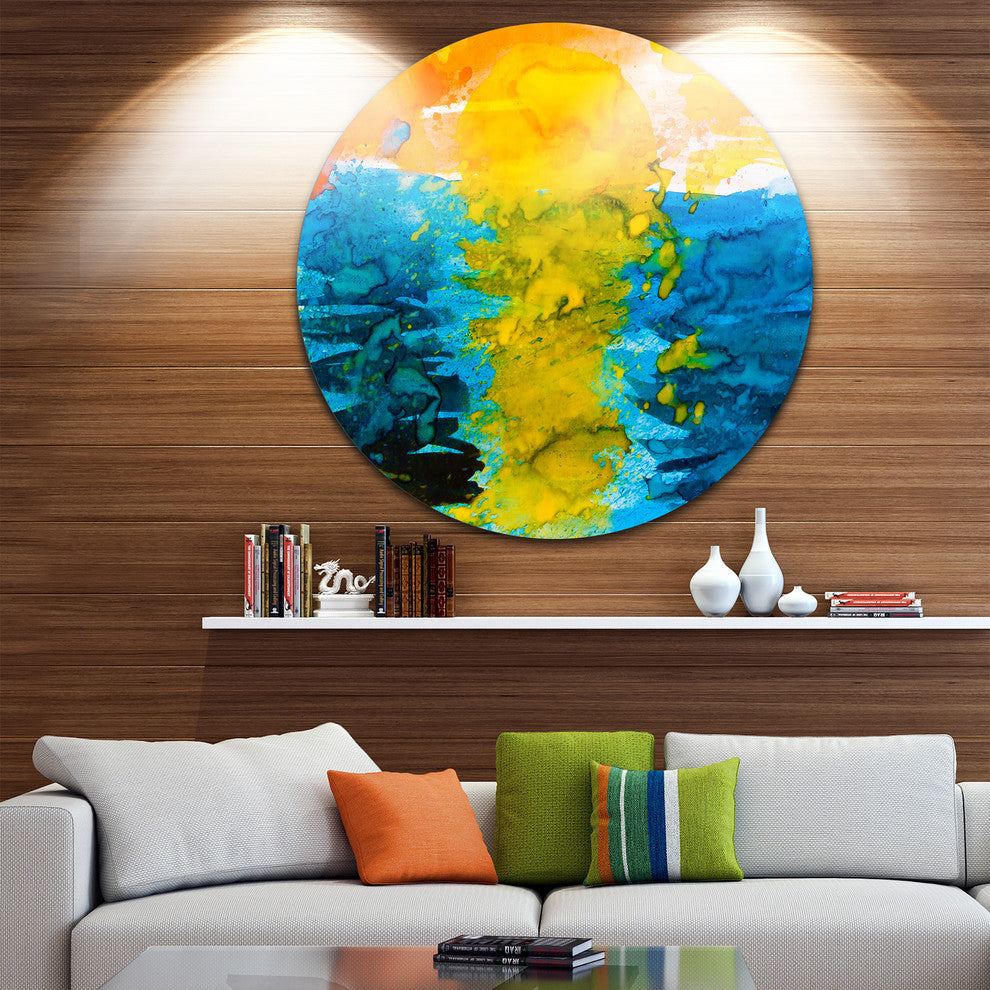 Bring Contemporary Abstraction to your home with this large Circle Metal wall art. This Sea Texture in Yellow Blue Metal Artwork makes it the focal point of any room or office.