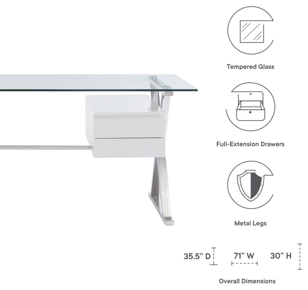 Create a space of distinction with the eye-catching, modern silhouette of the Sector Glass Top Office Desk. Resting on a polished stainless steel X frame, this computer desk is complete with a tempered glass tabletop and two sets of floating full-extension drawers that offer ample storage space for all your office essentials. Inspiring focus and productivity, this writing desk is ideal for the office, college dorm room, or any workspace. Includes non-marking foot pads to protect flooring. Assembly required. Weight Limit: 331 lbs.Set Includes:One - Office desk - DrawerOne - Office desk - Glass table topOne - Office desk - LegOne - Office desk - Support barModern Office DeskTempered GlassPolished Stainless Steel BaseFull-Extension DrawersNon-Marking Foot PadsAssembly RequiredWeight Limit: 331 lbs.Product Color : WhiteOverall Product Dimensions: 25"L x 71"W x 30"HTable Top Thickness: 1"HDrawer Frame Dimensions: 14.5"L x 122"W x 2.5"HLeg Dimensions: 22"L x 2"W x 1"HBase Dimensions: 22"L x 45.5"WProduct Materials : KD ; Steel steel/MDF ; Tempered glass ; MDF board ; P2 ; White foot felt padsProduct Weight : 115 LBs