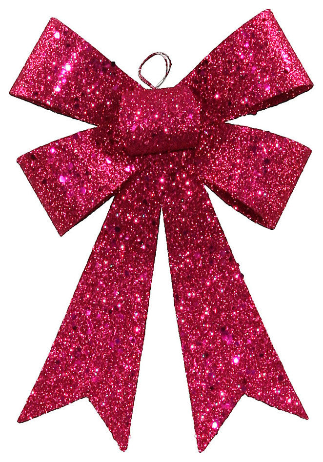Cerise pink bow is accented with sparkling glitter and sequinsOne-sided, flat back ornamentCome ready-to-hang on wire loopsDimensions: 7"H x 5.5"W x 1"DMaterial(s): Plastic/wire