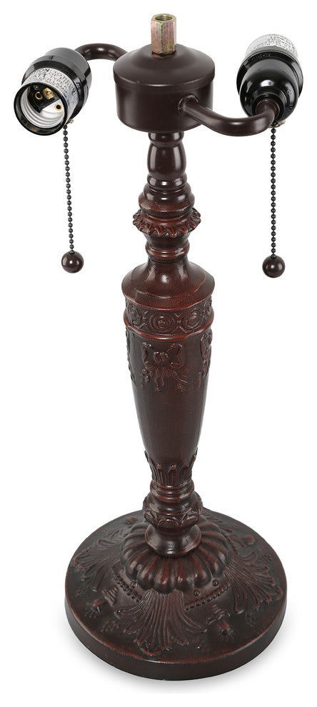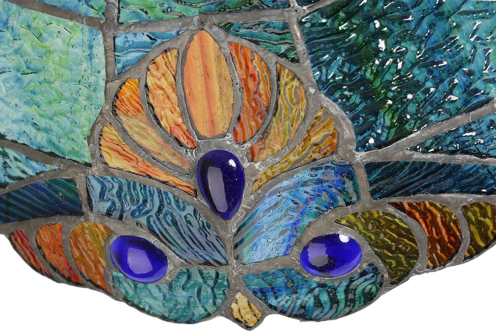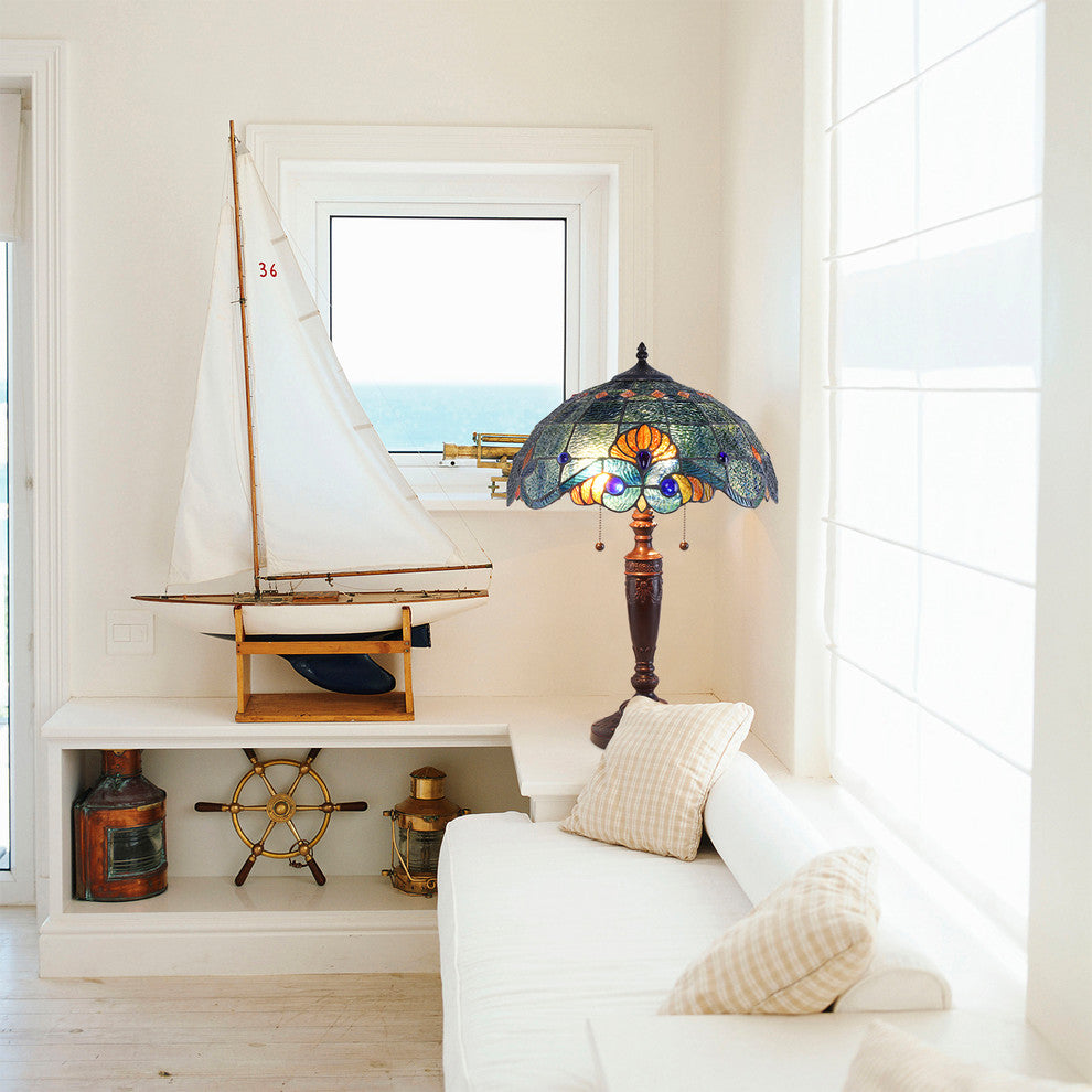 This unique Tiffany Style Blue Vintage Table Lamp has been handcrafted using stained glass for the shade. The shade uses blue-green stained glass pieces accented with orange pieces on top and cream stained glass in a scalloped design. Jeweled blue glass finishes the piece and looks stunning, especially when lit.Textured pearled bluish-green stained glass shade with beautiful scalloped designThe lamp is 23" tall x 16" in widthEasy to use 2 pull chains for on/off lighting. Uses two 60-Watt bulbs and can use CFL or LED bulbs. Bulbs not included. UL listed.