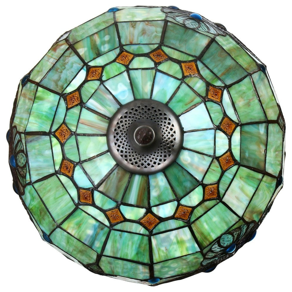This unique Tiffany Pearl Vintage Table Lamp has been handcrafted using methods first developed by Louis Comfort Tiffany. The shade contains pieces of stained glass, each hand-cut and wrapped in fine copper foil and fits perfectly in any room or office. This lamp has jeweled accents on the shade to create a stunning addition to your decor.Shade has beautiful colors of pearlized blue-green with blue cabachonsThe lamp is 23" tall x 16" in widthEasy to use 2 pull chains for on/off lighting. Uses two 60-Watt bulbs and can use CFL or LED bulbs. Bulbs not included. UL listed.