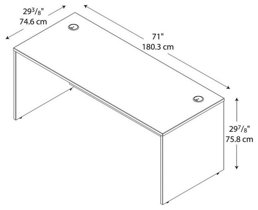 Get a wide work surface and opportunities for expansion with the Bush Business Furniture Series C 72W x 30D Office Desk. Spread out with your paperwork, computer, phone and more on the rugged thermally fused laminate surface while concealing your cables in wire management grommets for a clutter-free work area. Depend on continued quality with a heavy-duty design, thick end panels and tough edge banding. Use the Office Desk by itself or expand your workspace with matching Series C products to form an L or U Shaped configuration. Complete your office by adding a Hutch, Mobile File Cabinets, Keyboard Tray or Pencil Drawer (all sold separately). Extended modesty panels and clean lines make a lasting impression. The options are endless with Series C. This affordable furniture boasts quality craftsmanship to withstand the rigors of a 40-plus hour work week and comes with a 10 Year Warranty. Seven stylish finishes blend seamlessly in any environment. Multiple layout options meet the needs of numerous workspaces, from the private or home office to reception areas and conference rooms. Series C evolves with your preferences, allowing you to reconfigure your workspace as required with a complete line of coordinated commercial office furniture.Features: • Finish: Hansen Cherry • Material: Thermally Fused Laminate Over Engineered Wood • Thermally fused laminate work surface, rugged edge banding and sturdy end panels fend off scratches and damage • Wide Desk surface offers space to spread out and integrated wire management to conceal your cables • Accepts Return or Bridge on right or left side to form L or U Shaped configurations • Use as a standalone Desk or expand your workspace with a 72W Hutch, Pedestals, Pencil Drawers and Keyboard Trays (all sold separately) • Series C complements your office with clean lines, extended modesty panels and 7 finish options • Meets ANSI/BIFMA quality test standards for performance and safety • Assembled in the U.S.A. with U.S.A. & Imported Parts • Commercial quality backed by 10 Year WarrantySpecifications: • Product Dimensions: 29.84" H x 71.1" W x 29.37" D • Product Weight: 130 lbs • Product Color: Hansen Cherry