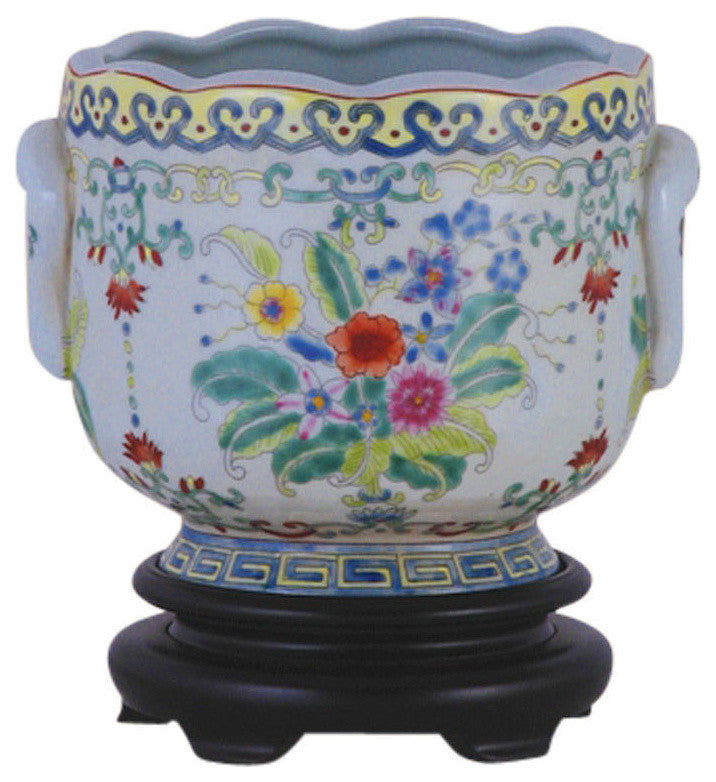 Beautiful Asian theme porcelain piece perfect to accent any home decor in the theme. We are committed to bringing high quality and affordable prices. Our porcelain pieces are handmade during parts of the design process so there will be some inconsistencies in design and coloring from photo at times due to each piece having its own unique structure. We are Asian Style Furnishing and we are here to help you add beautiful Asian colors and history to your home. We speciallize in porcelain items as well as creating fantastic lighting with our pieces. All of our items are for decorative use only not good for food storage. All of our items are for decorative use only not good for food storage. We have been in business for over 30 years and I am the second generation to be in this business. I am excited to bring my energy and family experience to those in need of some Eastern influences in their home. Please note : As most of our porcelain pieces are hand made and hand painted they may be slightly different from the photo in both shape and the way it is even colored! We do our best to find the one that is most common but sometimes they will be slightly different. Pair Round Scallop Rim Floral 2 Porcelain Pot Wooden Base 7" Country of Origin: China Dimensions (in inches): Height: 7" Length: 5.5" Depth: 5.5"