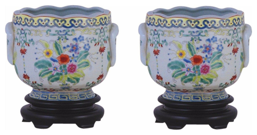 Set of 2 Round Scallop Rim Floral 2 Porcelain Pot Base 7"