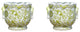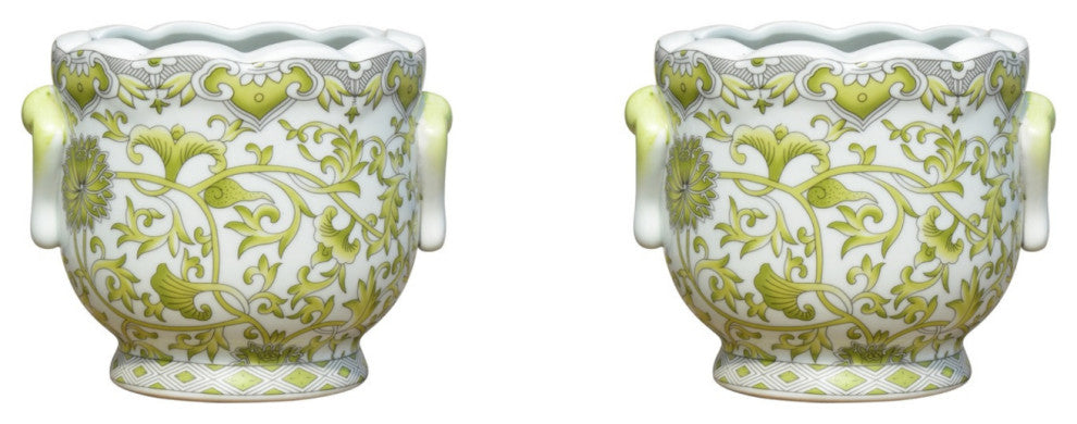 Set of 2 Round Scallop Rim Green and White Lotus Porcelain Pot