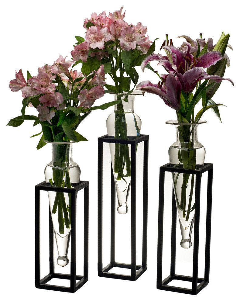 Add an elegant detail to your home decor with this set of vases in square tubing metal stands. This decorative accessory is made of recycled glass and iron with glass being easily removable for cleaning. Add your favorite blooms, single buds or small bouquet to this striking vase set and set it together or apart for a breathtaking focus piece.
