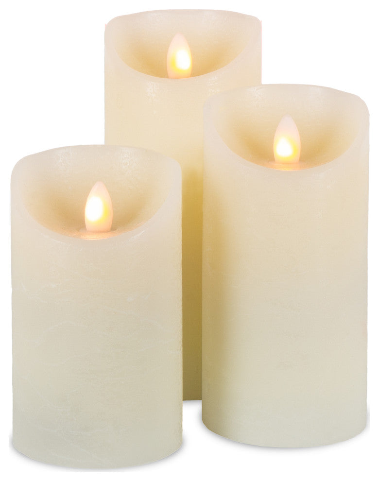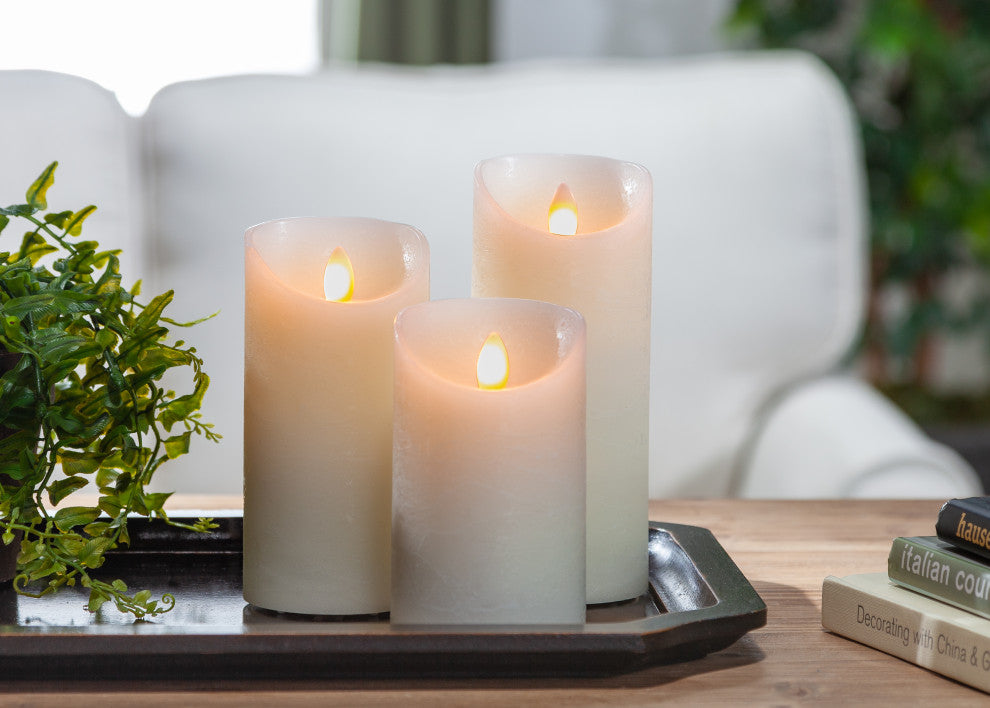 Set of 3 Bisque LED Pillar Candles With Aurora Flame and Remote Control