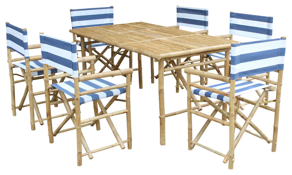 Set of Bamboo Rectangular Table, 6 Director Chair, Navy and White Stripes