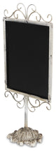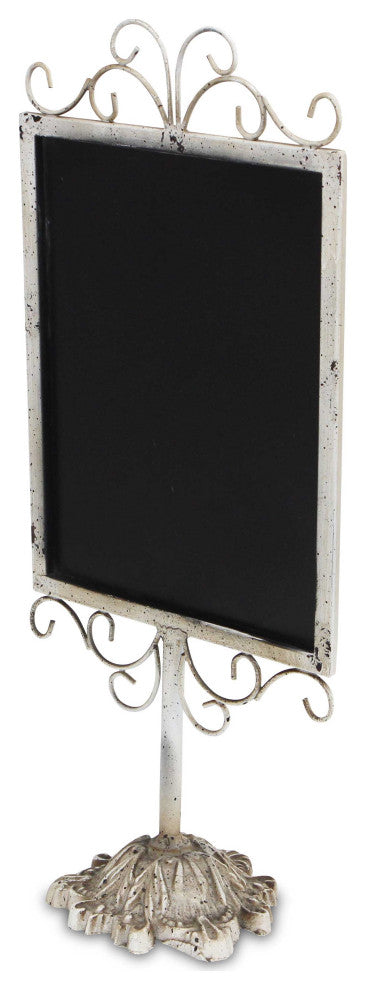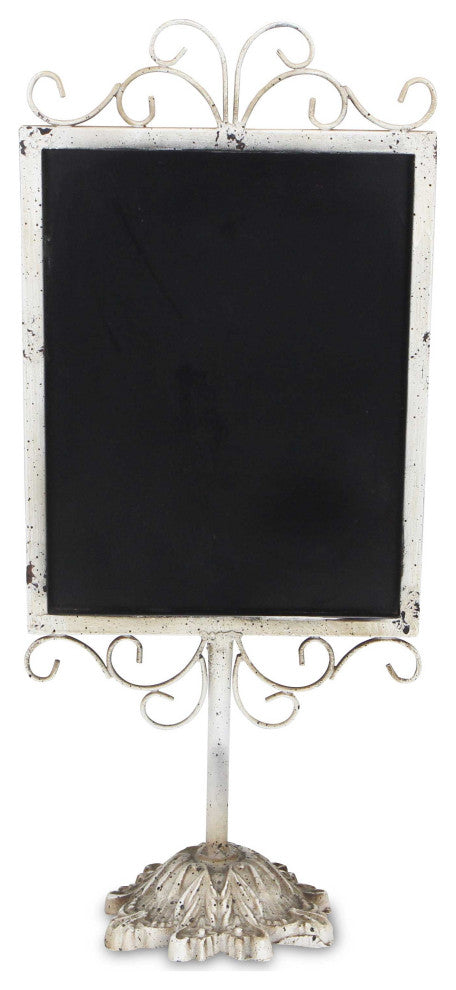 Enhance a blank table or liven up a muted space with Shabby Chic Standing Vertical Chalkboard. Perfect for jotting down the weekly menu or important reminders, the Shabby Chic Standing Vertical Chalkboard is a wonderful addition to your bedroom, kitchen or home office. Featuring an antiqued white metal frame, this elegant chalkboard includes detailed scroll accents and a sturdy base. A unique combination of bold and delicate design, the Shabby Chic Standing Vertical Chalkboard is a unique piece that will add a touch of vintage charm to any space of your home.