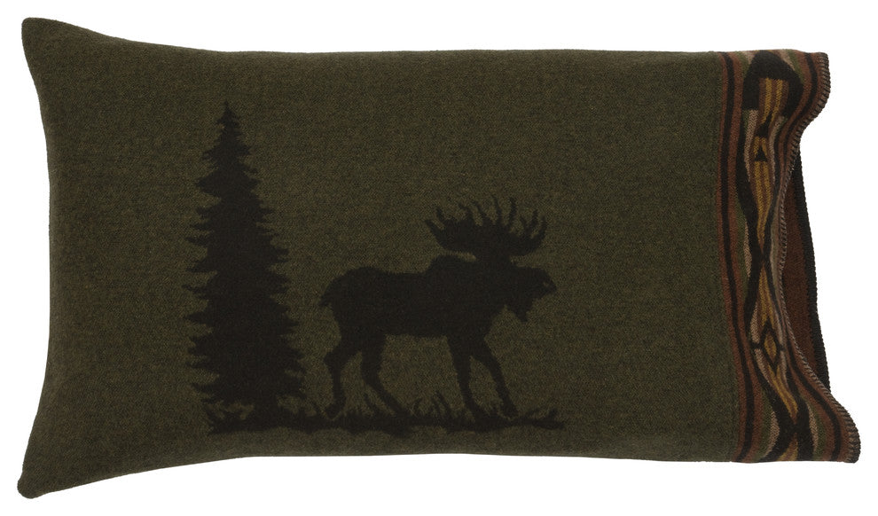 Moose I washable wool blend pillow case style sham shows rich earthly tones of green featuring a silhouetted moose and geometric patterns. Classic lodge style elegance! Decorative blanket stitch on outer edge opening.