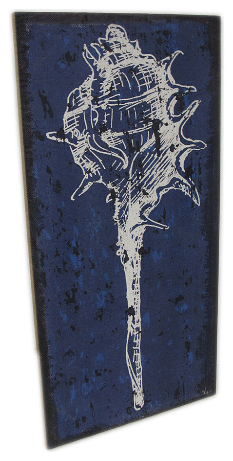 A spiny white murex shell stands out against an artistically distressed blue finish in this wall hanging that looks amazing in dining rooms, bedrooms, baths, or near the entry. This 35.5-inch high, 17.5-inch wide, 1-inch deep (90 X 44 X 3 cm) wall hanging is printed on burlap canvas stretched over a wood frame with an attached hanger on the back that makes mounting easy, and it''s great as a gift for sea life lovers sure to be admired!