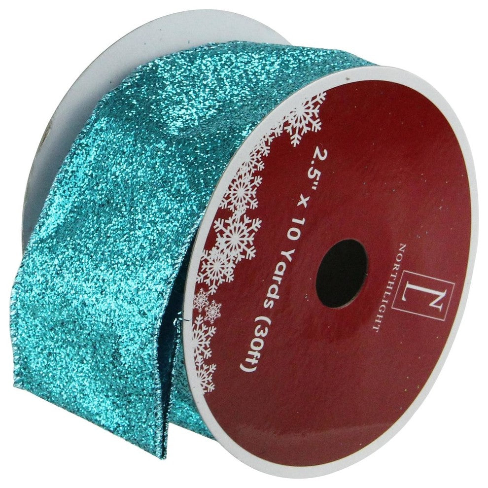 Glittering solid teal ribbon features shiny teal wired trim perfect for Christmas decorating or gift accenting Sewn wire edged ribbon allows you to bend and shape your creations to decorate with ease Ribbon comes on 12 separate spools Dimensions of each spool: 2.5" wide x 10 yards in length Material(s): polyester/wire Pack includes 12 spools of the ribbon shown for a total of 120 yards of ribbon