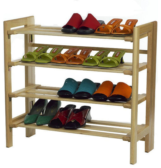 Plenty of storage is available on this foldable shoe rack which can hold at least a dozen pairs of shoes and can also be stacked on top of another unit practically doubling your storage. It''s a simple yet functional design and allows you to organize your entryway, mudroom, or even garage. The overall size of the shoe rack is 27.8"W x 11.5"D x 25.9"H. The clearance between each shelf is 5.5" and has a weight capacity of 25lbs per shelf. It is made of solid wood in a natural finish. Assembly required.