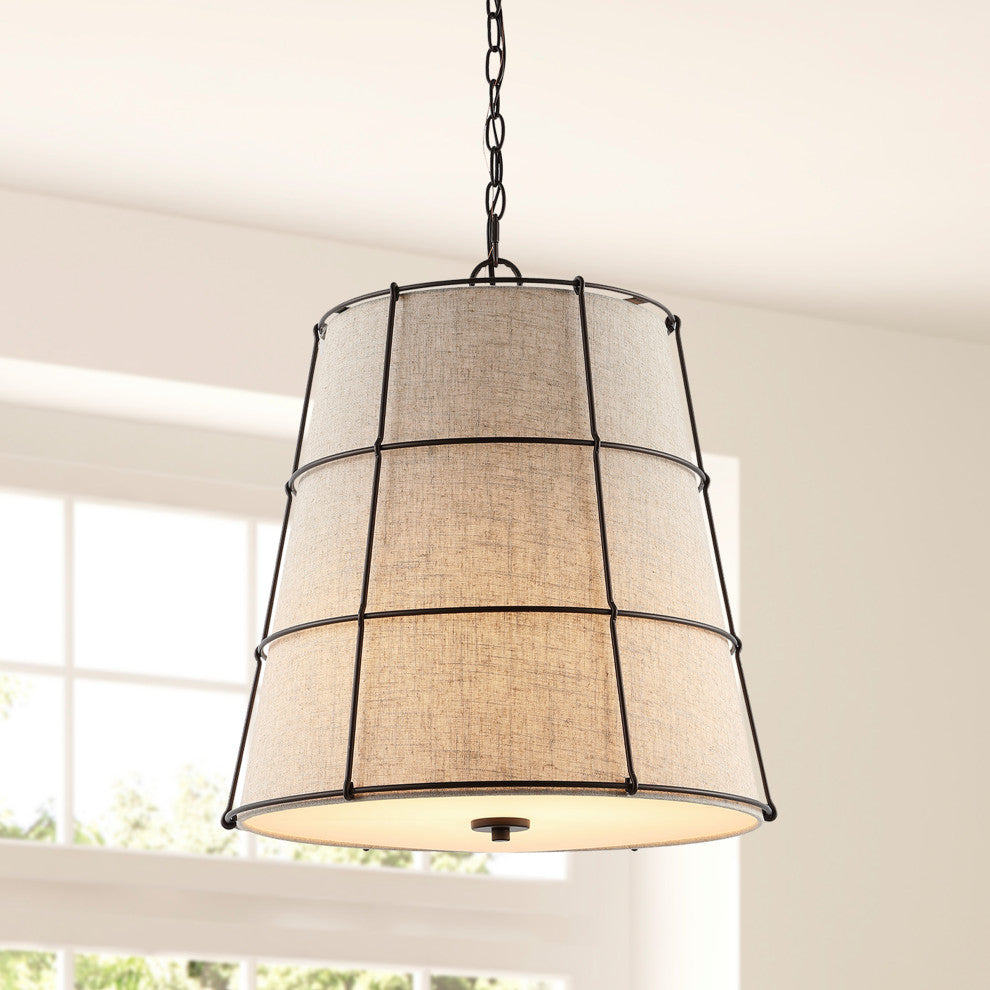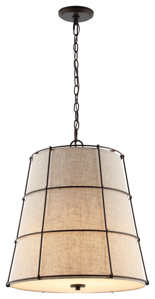 This farmhouse-inspired pendant light fixture is perfect for both traditional and modern homes. The angled linen-look shade is accented with a rustic metal frame. A warm beige diffuser panel conceals the bright LED light bulbs, creating a polished look for the kitchen, dining room, or bedroom.Features:• This conical pendant has a linen shade for diffused light, and a rustic, farmhouse style bronze frame• Adjustable-height pendant works best for ceilings up to twelve-feet high• Replace outdated ceiling lights with this rustic linen-shade pendant for an instant farmhouse makeover• Takes 3 bulbs and compatible with TYPE "A" 40W or CFL 13W or LED 9W• Color: Oil Rubbed Bronze with light brown shade• Body Material: Metal• Includes: One (1) lamp• Assembly RequiredDimensions:• Lamp: 27-86 inches high x 19 inches wide x 19 inches deepAbout us:You see a lamp.We see a decorative work of art.A perfectly curved shade casts a dramatic shadow on a floor. Compatible with LED lightbulbs: as easy on the environment as they are on the eyes. The JONATHAN Y Lighting collection considers every detail from impeccably sourced materials to designer styling. And our prices are so attractive, we''ve transformed a functional necessity into a fashion accessory.JONATHAN Y Lighting - a fashion revolution in home decor.