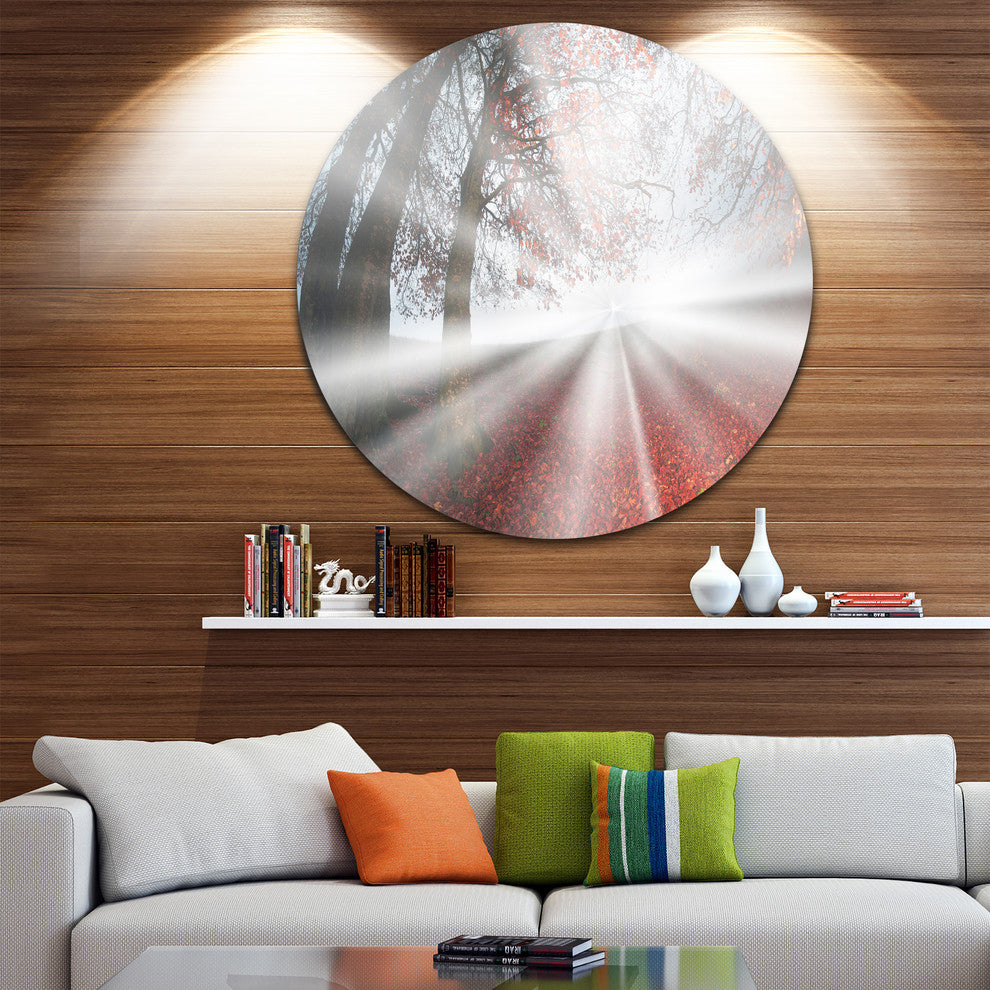 Silver Sun Rays To Foggy Forest, Landscape Photo Disc Metal Art, 38"