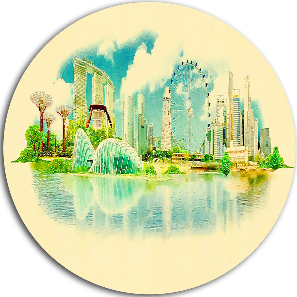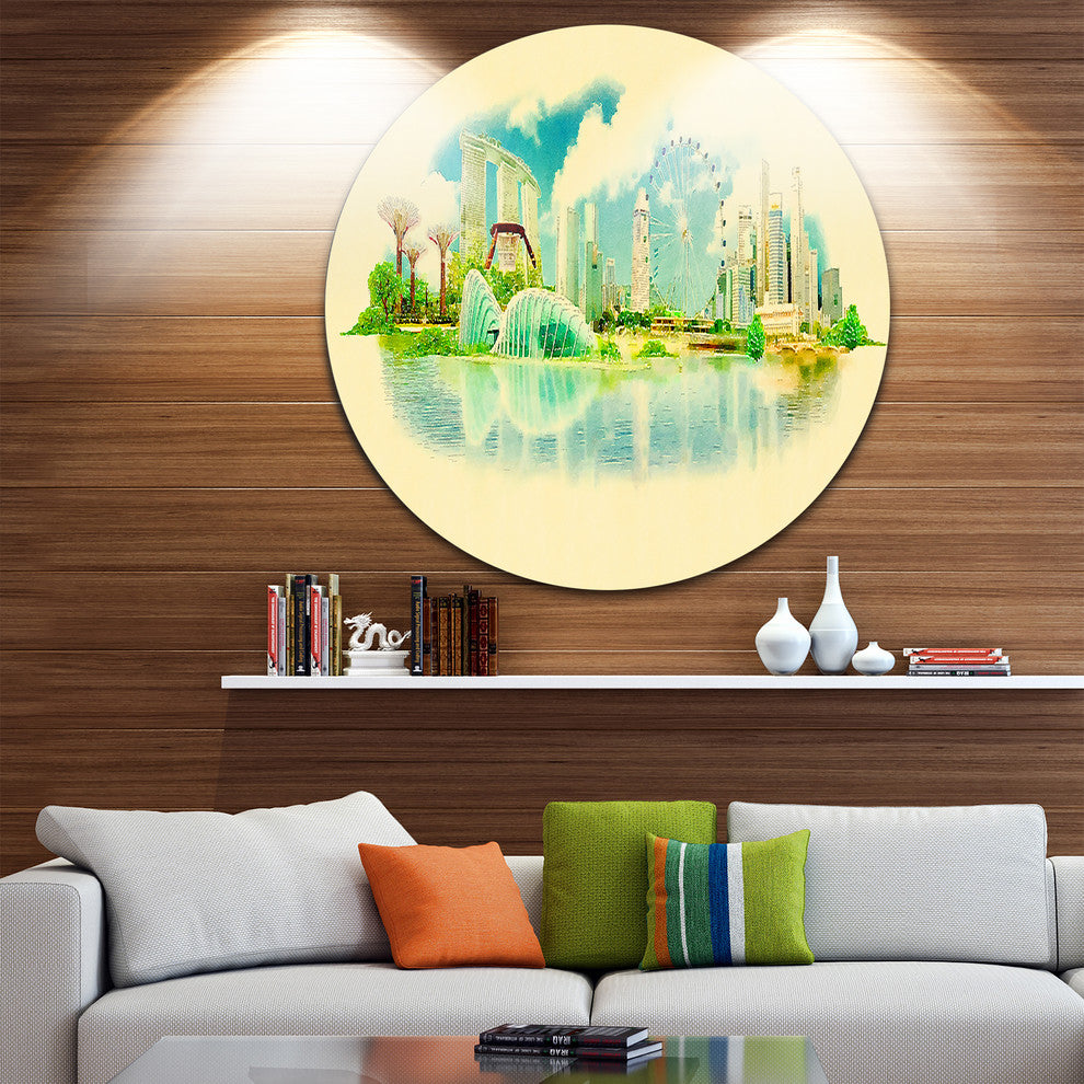 Singapore Panoramic View, Cityscape Watercolor Disc Metal Wall Art, 36"
