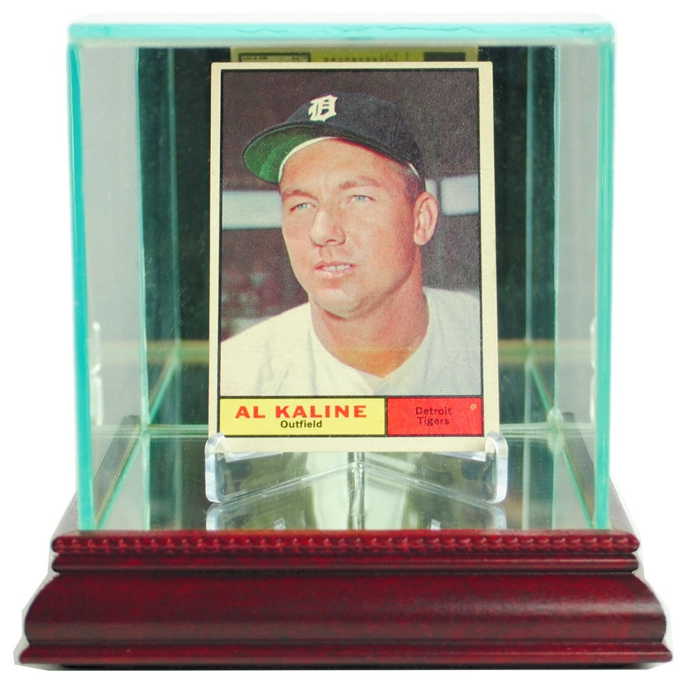 Protect your card with our real glass Single Card Display Case. This display case is made with mirror on the bottom and back to give a full view of your card. This case is UV protected and is supported by real wood moulding. Our adhesives contain no acids that may deteriorate signatures. This case also comes with a clear acrylic card holder.