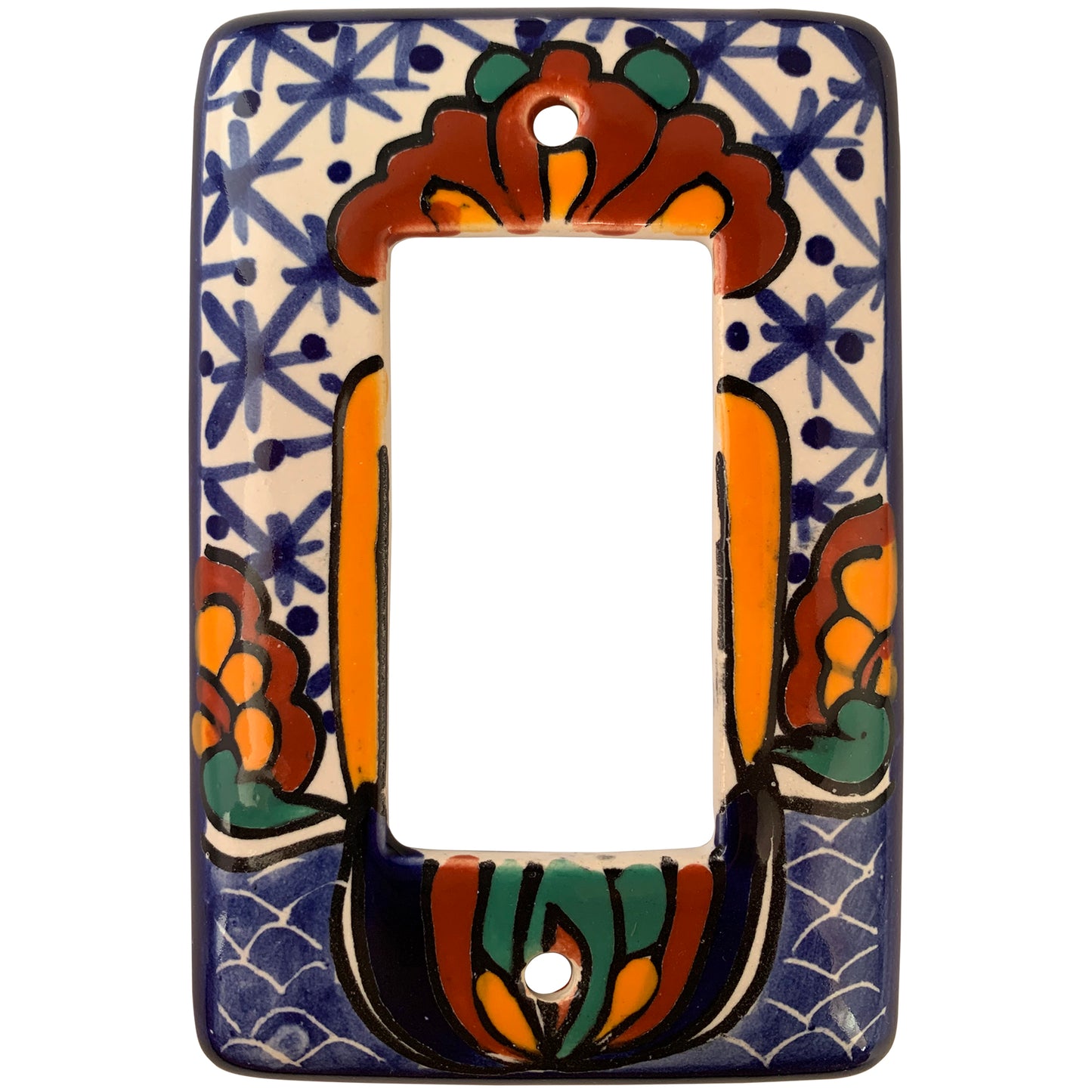 This ceramic switch plate is completely handmade and fired at high temperatures to give its hardness. It will fit a standard one-decora plate size. This particular design is painted in colorful strokes very similar to Turtle design, except some colors changed for a beautiful design. Actually, most of the Talavera ceramic items are painted first hand with white, then on top of the white the foreground decoration is drawn on top of it. For a hacienda, country or South-Western style this switch will make a unique accent into your place. All of our Talavera Mexican switch plates come with ivory-painted head screws.Hand-hammered and mold-cut to perfectionHandcrafted by Mexico''s Finest ArtisansWe include 1" long brown screws in all of our hammered copper switch plates