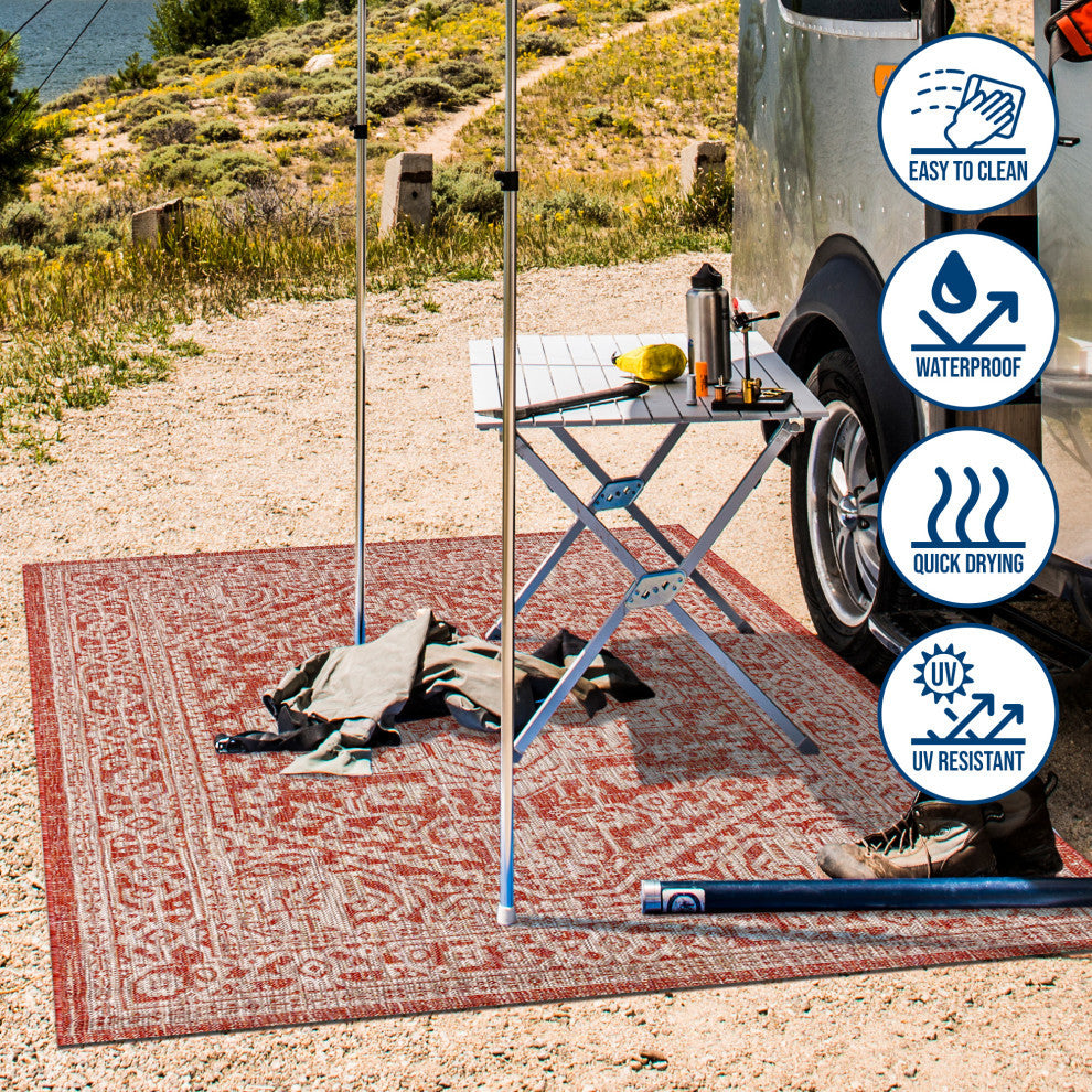 This ornate medallion rug''s lively pattern adds exotic style to an outdoor porch or patio. Varied tones of red and rust mingled with a taupe pattern give this rug a hand-woven, vintage vibe. The flatweave design is great for high-traffic spaces indoors too.Features:• Flat-weave construction of 100% polypropylene• Red and taupe with a handwoven mingled texture• Water resistance with 0.19" pile• 100% Polypropylene• No backing, use of rug pad is recommended (sold separately)• Power Loomed in Turkiye• Actual Dimension: 7 ft 9 in. x 7 ft 9 in. Round• Color: Red/Taupe• Thickness measures: 0.19 in.• Available in multiple sizes and/or colorsRug Care:• Vacuum regularly and spot clean as needed; avoid direct and continuous exposure to sunlight; use brushless vacuum; remove spills immediately; if liquid, blot with clean, undyed cloth by pressing firmly around the spill to absorb as much as possible; for hard to remove stains, professional rug cleaning is recommended; store in a dry, well ventilated area and rotate for consistent wear• Packing and shipping may cause temporary creases in rugs, which will flatten out after a week on the floor; to expedite the process, try back-rolling your rug before laying it down, and then allow ample time for the remaining creases to relax• Please Note: Due to differences in monitors, some rug colors may vary slightly. Lengths and widths may vary from the published dimensions. Patterns may vary slightly according to shape and size selected.About us:Style your floors with JONATHAN Y. By combining fine craftsmanship and design, this New York creative studio is bringing fashion to your floors. The collection mixes sustainable organic materials, vibrant colors and trend worthy styles to create JONATHAN Y''s distinctive catalog of rugs.