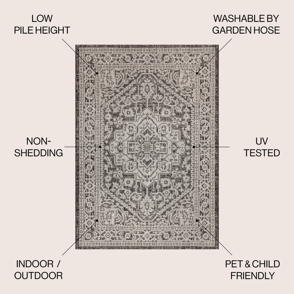 This ornate medallion rug''s lively pattern adds exotic style to an outdoor porch or patio. Varied tones of light gray mingled with a black pattern give this rug a hand-woven, vintage vibe. The flatweave design is great for high-traffic spaces indoors too.Features:• Flat-weave construction of 100% polypropylene• Light gray and black with a handwoven mingled texture• Water resistance with 0.19" pile• 100% Polypropylene• No backing, use of rug pad is recommended (sold separately)• Power Loomed in Turkiye• Actual Dimension: 6 ft. x 9 ft.• Color: Gray/Black• Thickness measures: 0.19 in.• Available in multiple sizes and/or colorsRug Care:• Vacuum regularly and spot clean as needed; avoid direct and continuous exposure to sunlight; use brushless vacuum; remove spills immediately; if liquid, blot with clean, undyed cloth by pressing firmly around the spill to absorb as much as possible; for hard to remove stains, professional rug cleaning is recommended; store in a dry, well ventilated area and rotate for consistent wear• Packing and shipping may cause temporary creases in rugs, which will flatten out after a week on the floor; to expedite the process, try back-rolling your rug before laying it down, and then allow ample time for the remaining creases to relax• Please Note: Due to differences in monitors, some rug colors may vary slightly. Lengths and widths may vary from the published dimensions. Patterns may vary slightly according to shape and size selected.About us:Style your floors with JONATHAN Y. By combining fine craftsmanship and design, this New York creative studio is bringing fashion to your floors. The collection mixes sustainable organic materials, vibrant colors and trend worthy styles to create JONATHAN Y''s distinctive catalog of rugs.