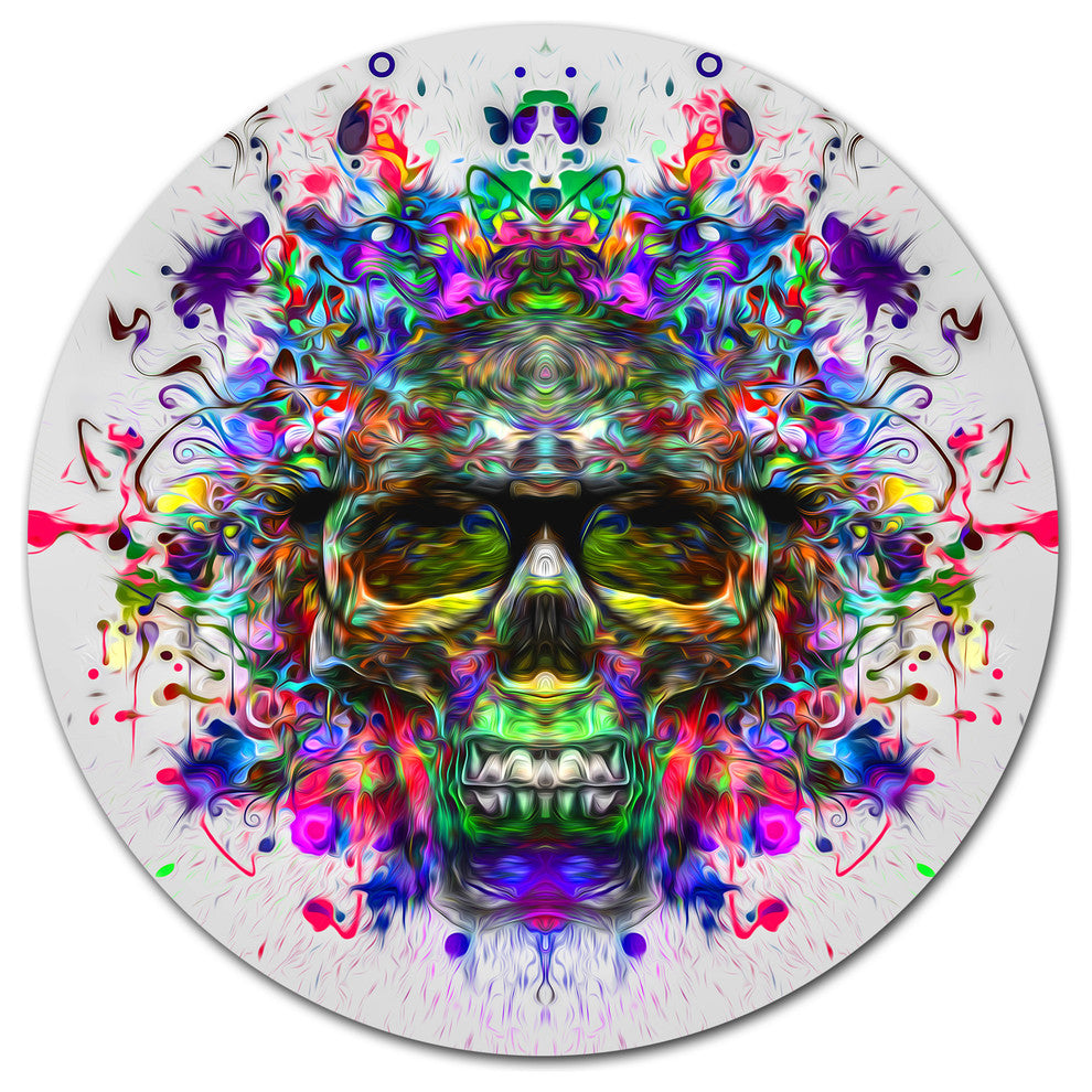 Bring Contemporary Abstraction to your home with this large Circle Metal wall art. This Skull with Glasses and Paint Splashes Metal Artwork makes it the focal point of any room or office.