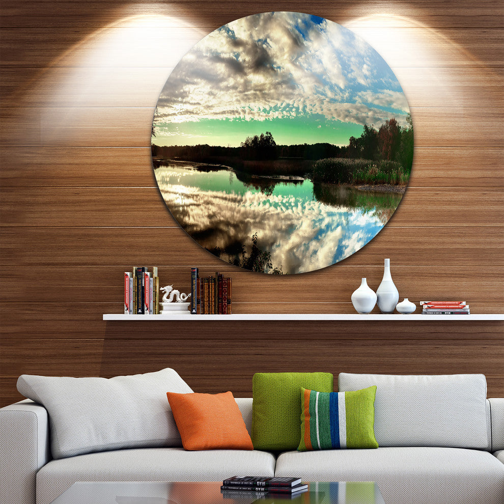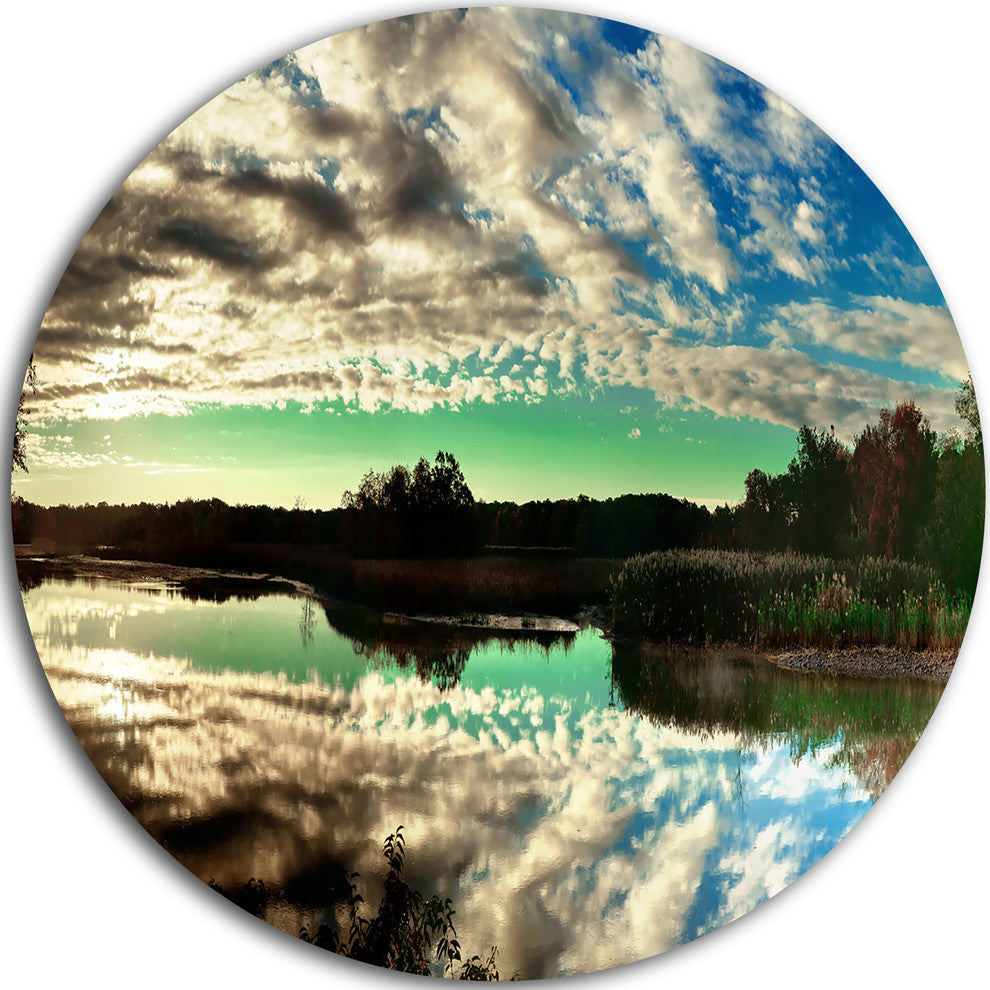 Bring Contemporary Abstraction to your home with this large Circle Metal wall art. This Sky Clouds Mirrored in River Panorama Metal Artwork makes it the focal point of any room or office.