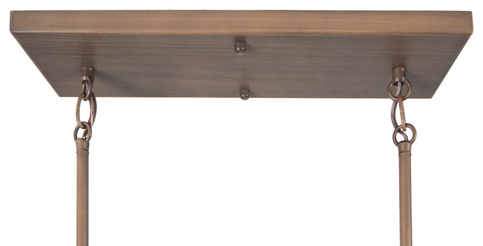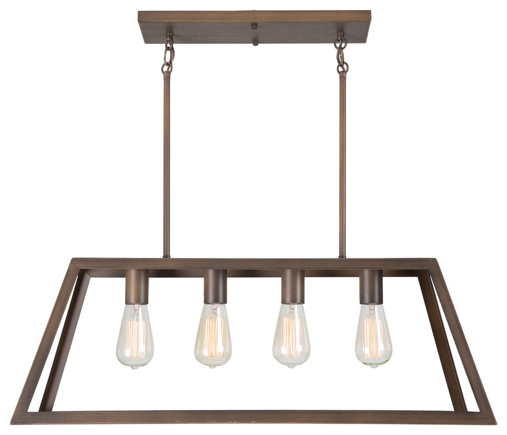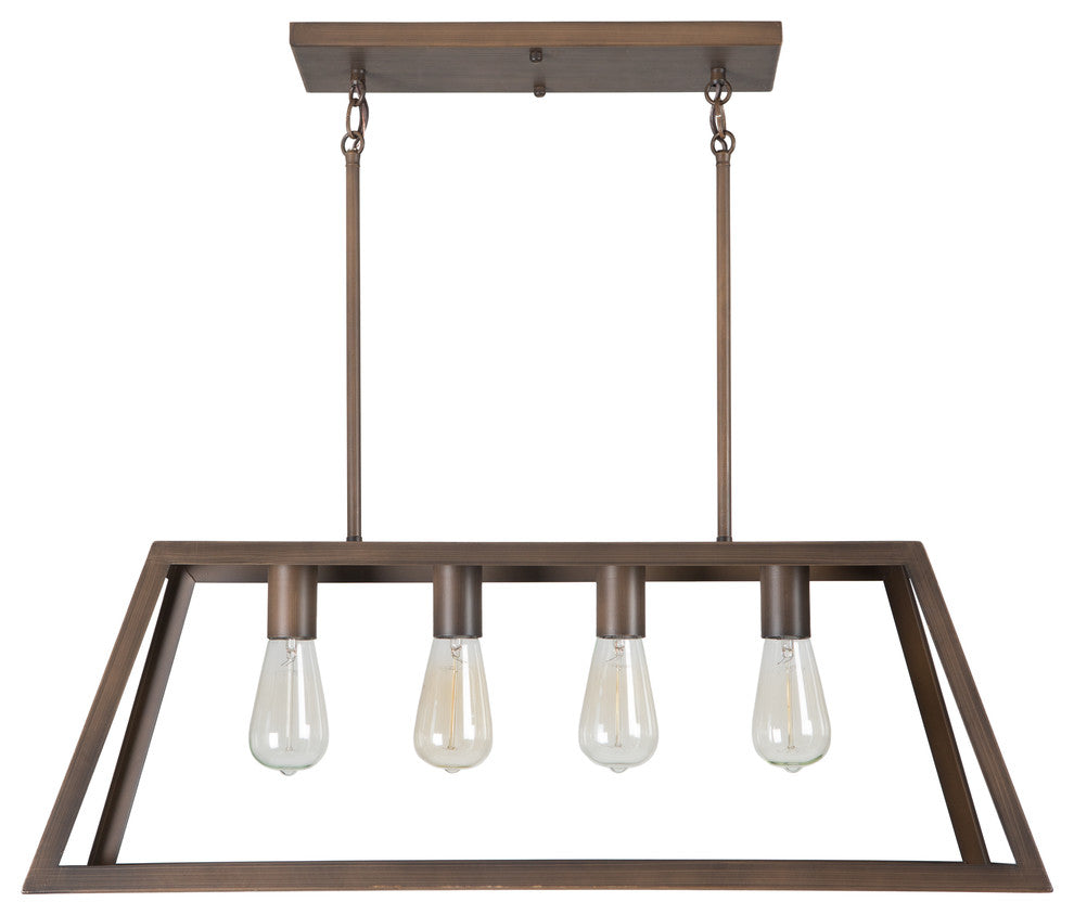 The Skyline Ridge Collection by Yosemite Home Decor features a transitional chandelier in oil rubbed bronze. The 4-light chandelier has a stylish contemporary design with clean lines in a minimalist form constructed of metal equipped with extension rods and wire for hanging. The elongated trapezoidal metal frame encasing the bulbs has no glass paneling allowing light to radiate from every angle of the chandelier. This fixture comes equipped with two sets of 6 inch and 12 inch rods for versatility in the hanging options. This light requires (4) incandescent medium base bulbs at a recommended maximum of 60-watts. The bulbs are not included in the packaging with the fixture but can be purchased separately. A limited 1-year warranty is also included at the time of purchase on parts only. Requires 60, A19, Incandescent light bulb.