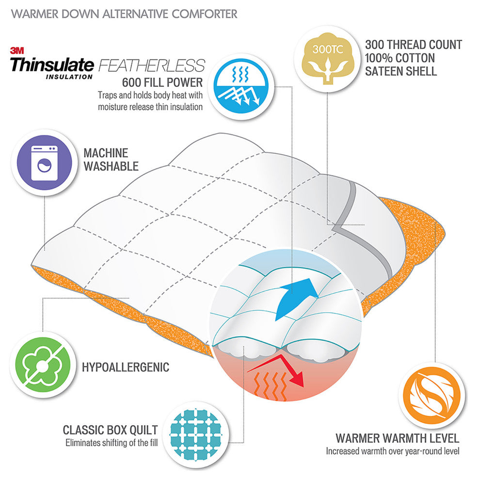 The Sleep Philosophy down alternative comforter collection features 3MThinsulateFeatherless Insulation-600 Fill Power, a kinder alternative to natural down. This revolutionary, loose fill-down alternative mimics or surpasses the performance of natural down in Fill Power, loft and overall performance. Made of durable, lightweight polyester fibers, 3MThinsulateFeatherless Insulation provides warmth without a single feather.The Sleep Philosophy down alternative comforter collection features a silky-soft 300 thread count, 100% cotton sateen cover. The comforters have sewn through box quilting so that the down-alternative fill doesn''t bunch or shift. Four corner loops on the comforter can be tied to help secure it within a duvet cover. The filling is also hypoallergenic so you''ll have a comfortable "sneeze-free" night''s sleep. It''s also machine washable for easy care. This comforter is also OEKO-TEX certified, meaning it does not contain any harmful substances or chemicals, ensuring quality comfort and wellness. Items in the set may come in a rolled or compressed packaging, which will need to be fluffed up or steam ironed before use to remove wrinkles.A great night''s sleep never goes out of style. That''s our Sleep Philosophy.Size : 1 Comforter: 68x88"Material: 300 thread count 100% cotton sateen, self cord, single needle, 8" box quiltingFilling: 3M Thinsulate featherless fiberFeatures: Patented 3MThinsulatefeatherless insulation-600 fill powerHypoallergenic fillingA kinder alternative to feathers, recommended by ducks and geeseMimics look and feel of natural down Silky soft 300 thread count 100% cotton sateenClassic box quiltingCorner loops secure insert to duvet coversOeko-Tex Certified, includes no harmful substances or chemicalsConveniently machine washable