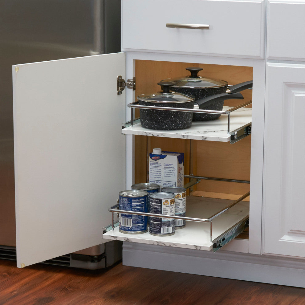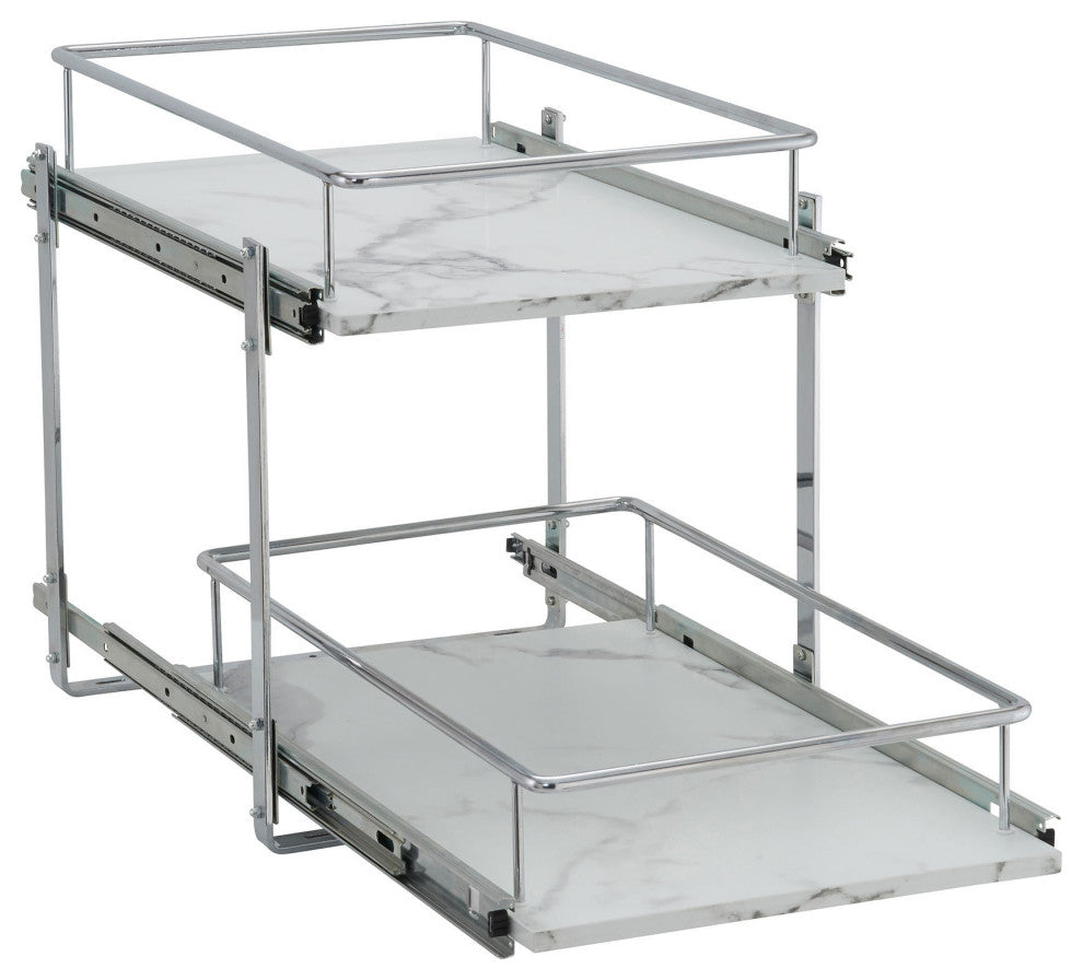 Command all the space in your cabinets with these sliding cabinet organizer shelves. These pull-out shelves make things in the back of your cabinets easy to access. Gone are the days of bending, kneeling or craning to reach things in the back corners of the cabinets. Each shelf can move independently of the other and glides easily to extend fully outside of your cabinet. The organizers are mounted on your cabinets to ensure they stay put even when the shelves are fully extended. This cabinet organizer is made of heavy duty steel chrome wire and sleek faux marble, elevating the look of any kitchen or bathroom. The marble shelves are attractive and reduce the risk of items falling through or getting caught on traditional wire shelves and baskets. Whether you use this sliding cabinet organizer to store small appliances, food, pots and pans, cleaning supplies, toiletries or anything else, this organizer will upgrade any cabinet situation. These shelves come ready to install with hardware included.