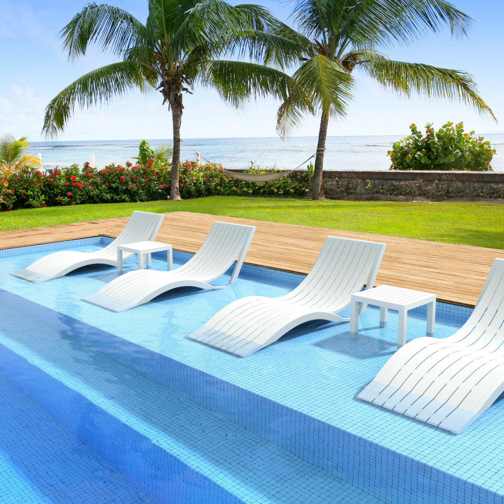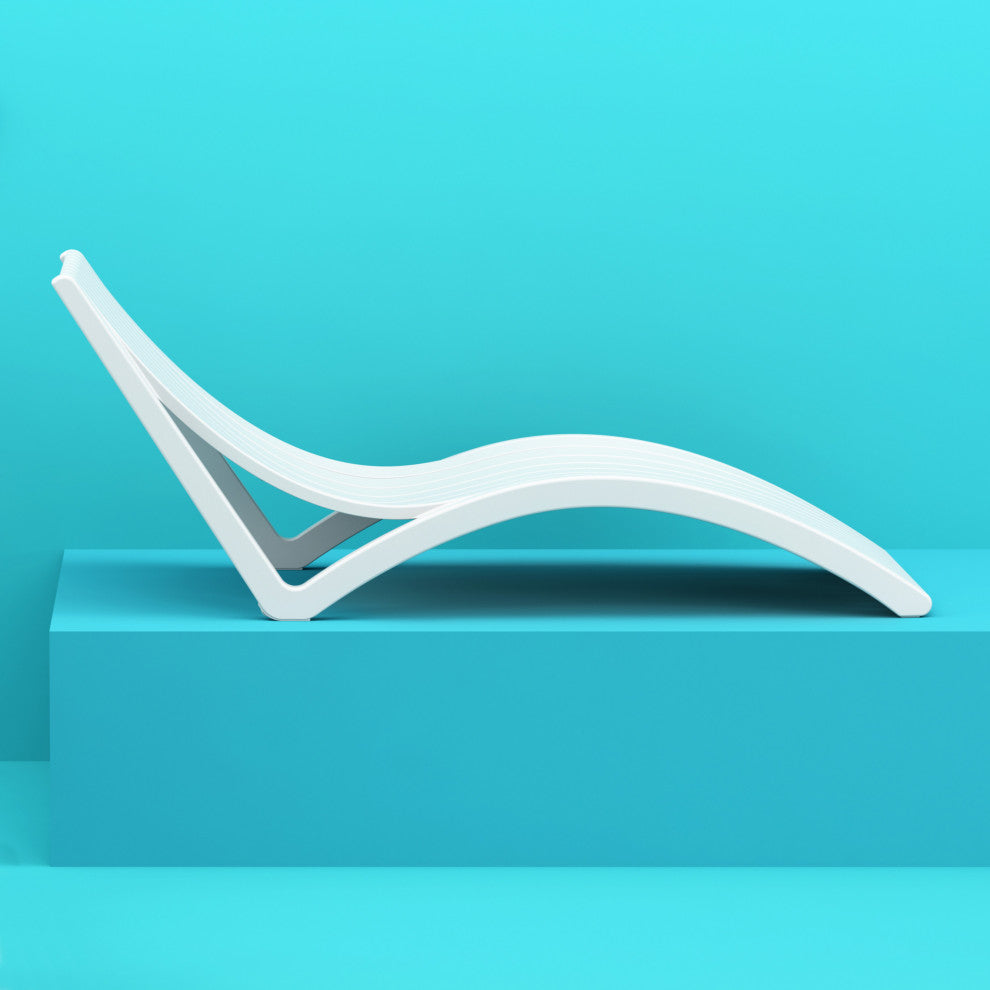 The attractive Compamia Slim Chaise Lounge Chair is strong, stable, and comfortable. Made of rigid marine grade, polypropylene resin. Stays cool to the touch, while resistant to suntan oils, chlorine, and saltwater. Pool chaise has hidden submerged wheels on the back legs for easy mobility. Easy to clean, maintenance free. Perfect for pools, and on the beach. (Note, when using in a pool or shallow water - this product should not be used in more than 10 inches of water. And when no person is on the chaise - the footrest side may float).Width: 28" - 24.5"Height: 28.5"Length: 70.9"Base length: 53" (From back legs to footrest)Seat Curved Length: 81"Arch Top Height: 11.5"Arch Bottom Height: 9"Weight: 33 lbs.