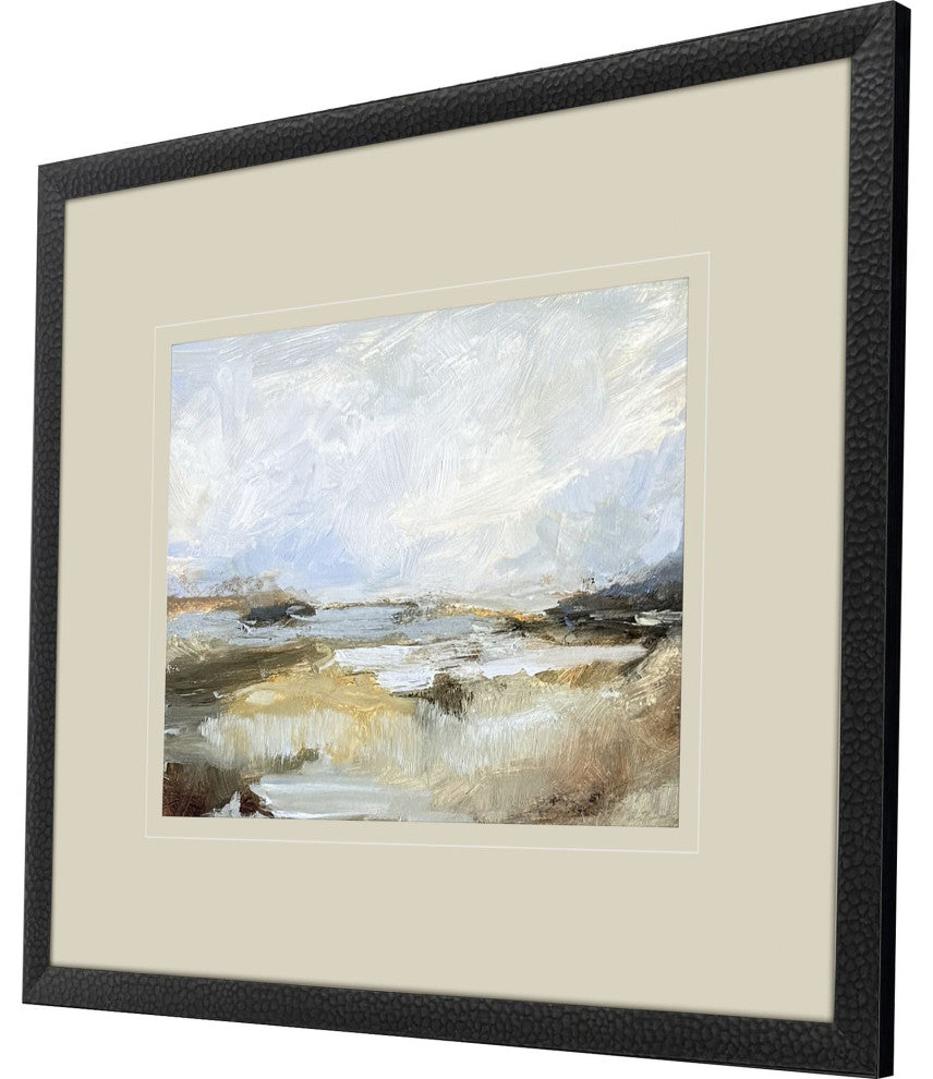 A tranquil coastline in soothing hues is double matted in putty. Giclee is framed in a modern rubbed matte espresso wood with honeycomb embossing.
