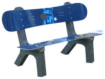 Benches are made entirely of recycled products and utilize recycled skis and boards. The Bench legs are made from recycled plastic and weigh 30lbs each. The recycled plastic legs are available in black.