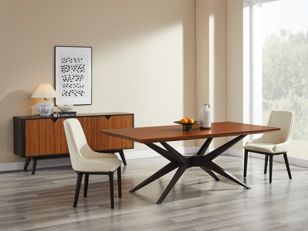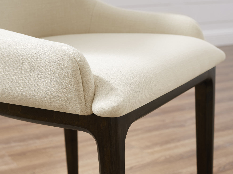 The Sofie dining chair blends comfort and elegance, with a design that cradles the body for ergonomic support. Its gently sloping arms, soft seat, and supportive backrest provide lumbar support, making it perfect for extended hours of sitting. Upholstered in LiveSmart performance fabric, a durable and stain-resistant 100% polyester, it offers both resilience and a soft touch. The artisan-crafted base and legs are made from solid bamboo, available in both Caviar and rich Black Walnut finishes. The Sofie chair combines style and comfort, making it an inviting addition to any dining space for family meals and festive gatherings.
